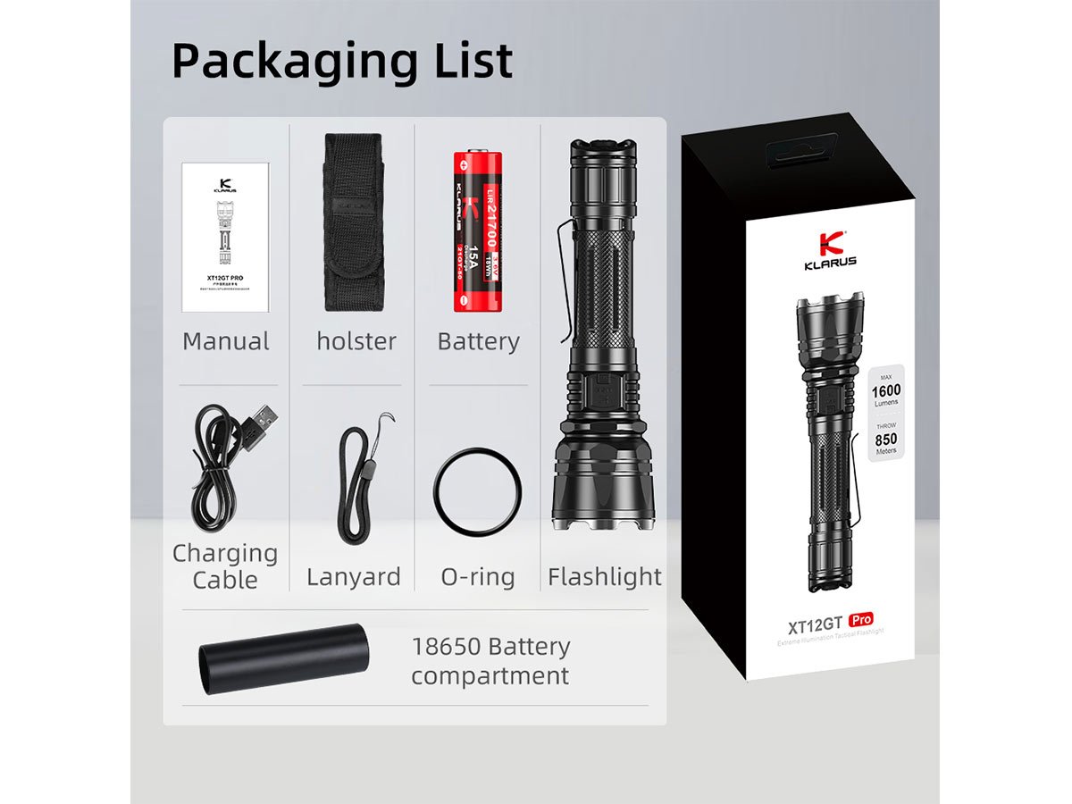 Klarus XT12GT-PRO USB-C Rechargeable LED Flashlight - 1600 Lumens - Includes 1 x 21700