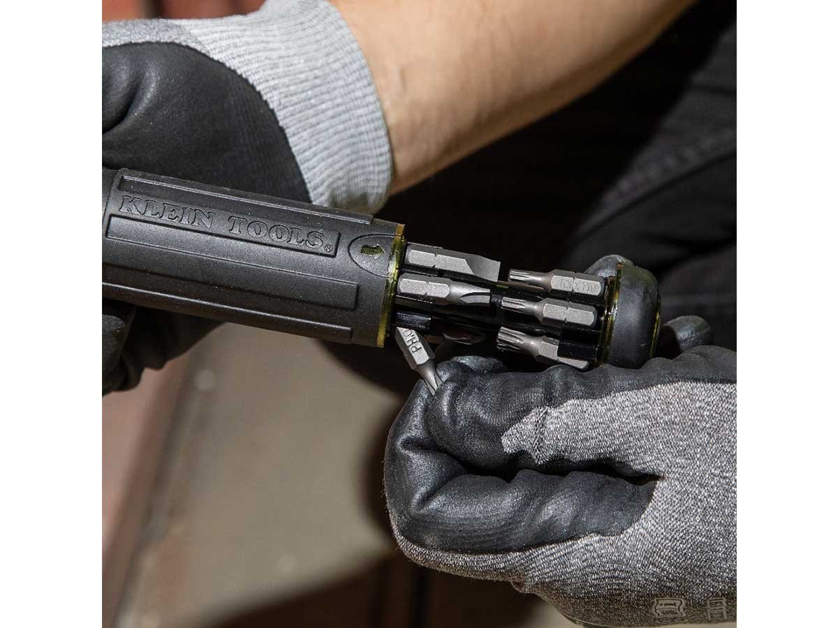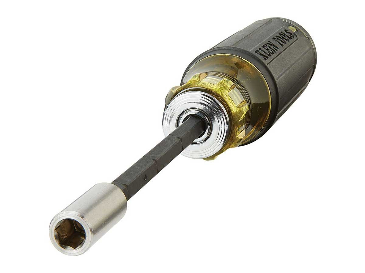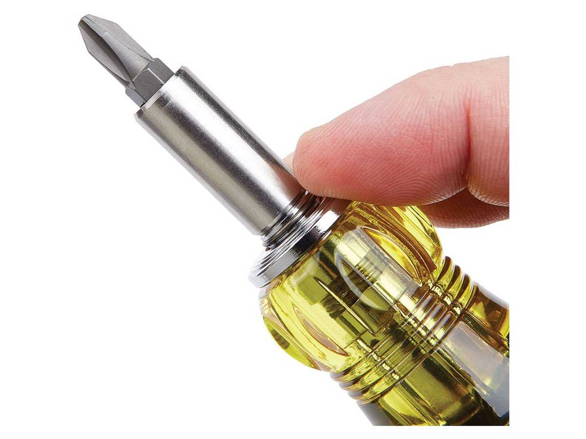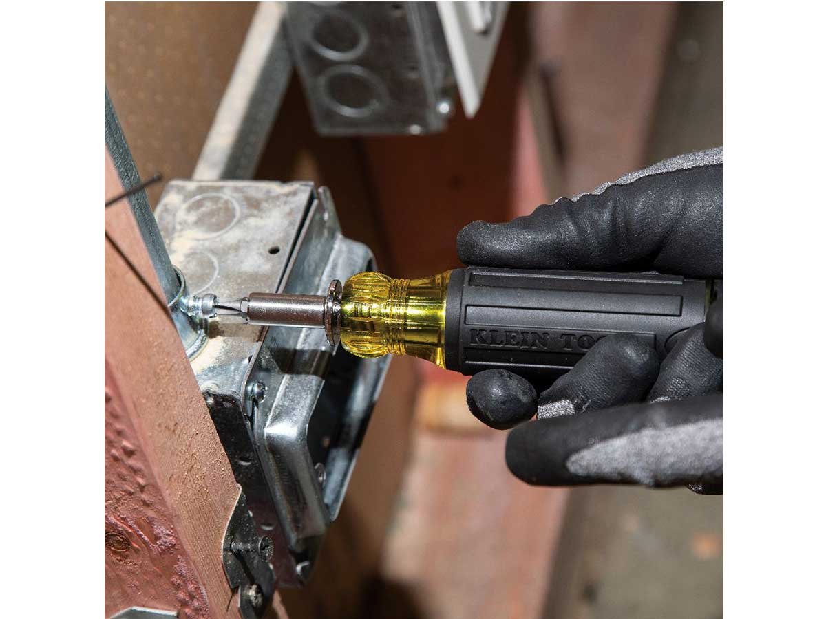 The Klein Tools 14 in 1 Adjustable Screwdriver is a tool designed to handle any and every job. This tool includes an incredible 13 individual industrial-strength screwdriver bits as well as a 1/4 inch nut driver, all of which are easily interchangeable to cut down on work time. For added convenience, all of these bits are stored on the inside of this product's handle. To prevent the potential of losing these bits, the holder also functions as a magnet thanks to its rare earth metal design, ensuring that you have everything you need at all times for your work.