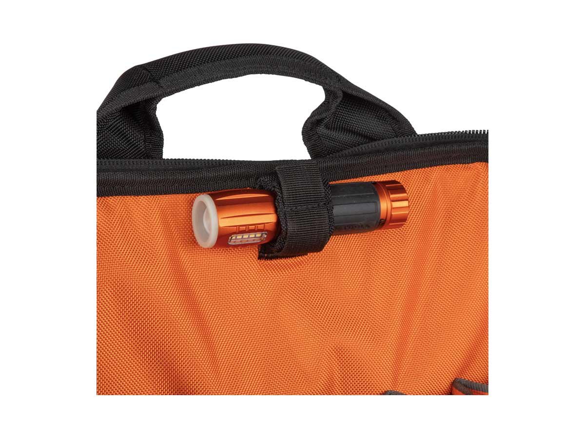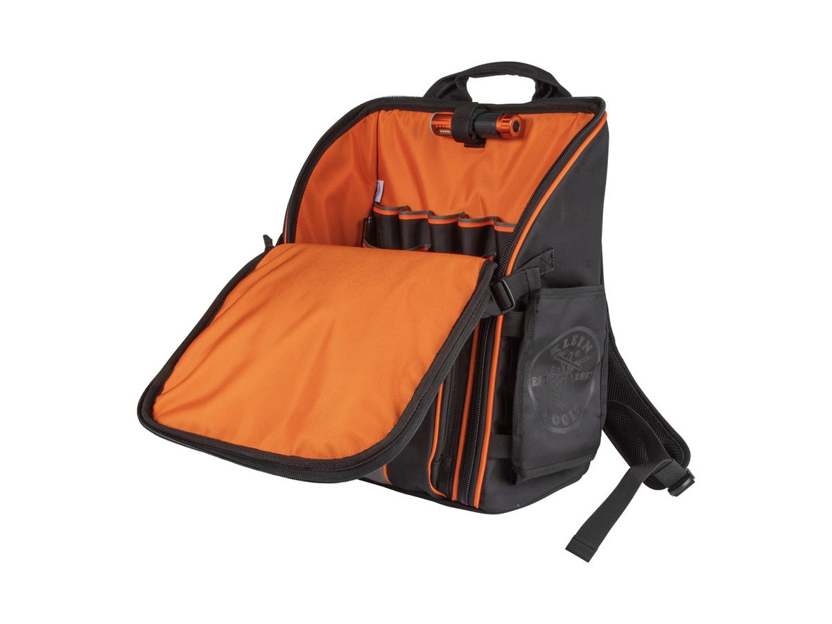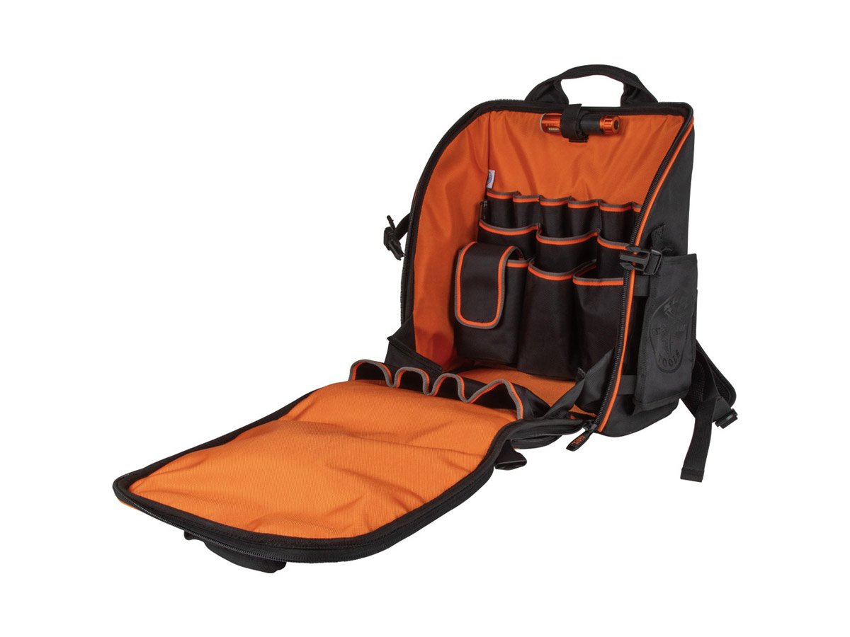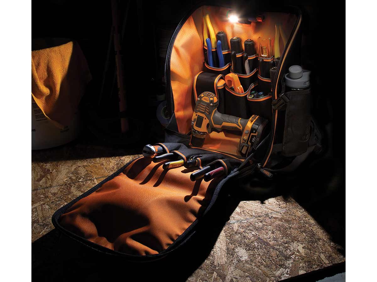 The Klein Tools Tradesman Pro Tool Station/Tool Bag Backpack is a utility backpack with an included flashlight! It features 21 pockets and a large interior for maximized storage of tools and other belongings critical to your job. For convenience, the front of the backpack unzips halfway for quick tool access or fully extends so you can access the entire compartment. The orange interior provides easy visibility of your tools even in low light conditions.