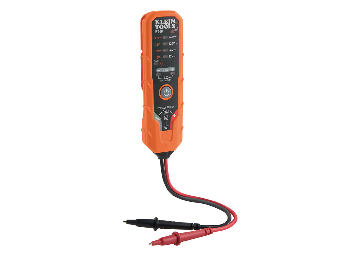 The new Klein Electronic AC/DC Voltage Tester is a lightweight and portable meter that can be used to check, verify, or troubleshoot common residential electrical problems. You can use this meter on light fixtures, doorbells, electrical outlets, on-going construction projects and more. This tester is equipped with indicators for positive and negative DC polarity, built-in leads with side holders, and a convenient battery indicator. Powered from just 2 AAA batteries, it is easy to find back up or replacement cells. When you are done with the meter or moving on to a different task, use the durable pocket clip for a hands-free way to carry it to the next job.