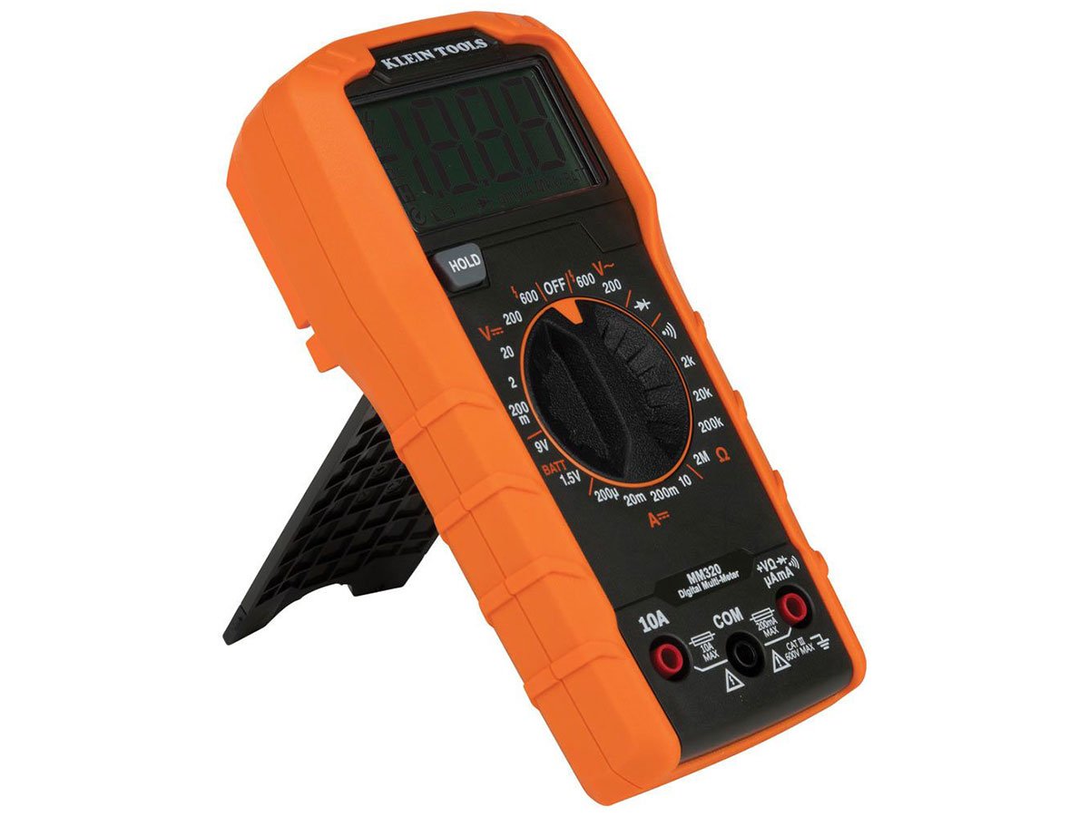 The Klein Tools MM320 Digital Multimeter is a manual ranging meter that can measure AC or DC voltage, resistance and current. Not only can this meter be used with wires and cables, but also batteries, diodes and continuity. This meter is equipped with a data hold button for capturing and holding a stable reading for ease of documentation and accurate measurement. It also has a built-in stand in the back so the technician can easily test and read measurements at the same time.