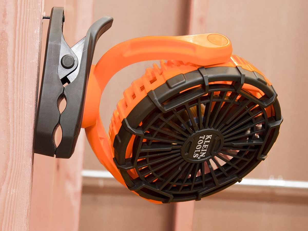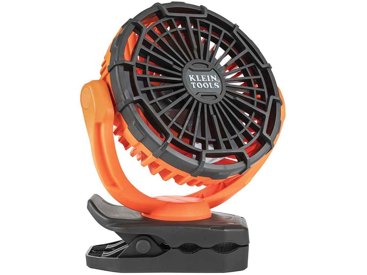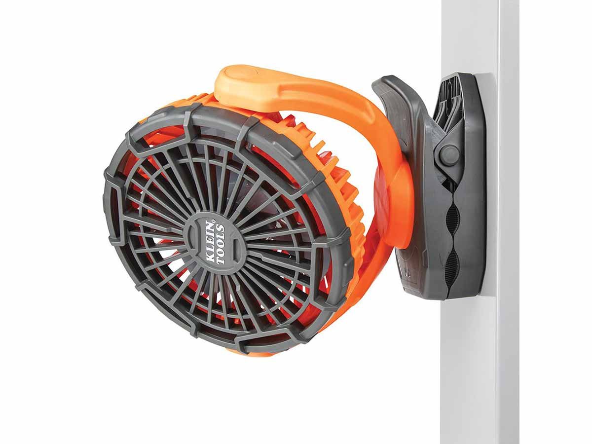 The Klein Tools Rechargeable Personal Jobsite Fan is a small fan ideal for the jobsite while working long hours in the heat. With a wide clamp and magentic base, either orient the fan in an upright position or clamp to a beam or other surface and direct the fan to point towards your space. The arm base rotates 360° so no orientation is out of question.
