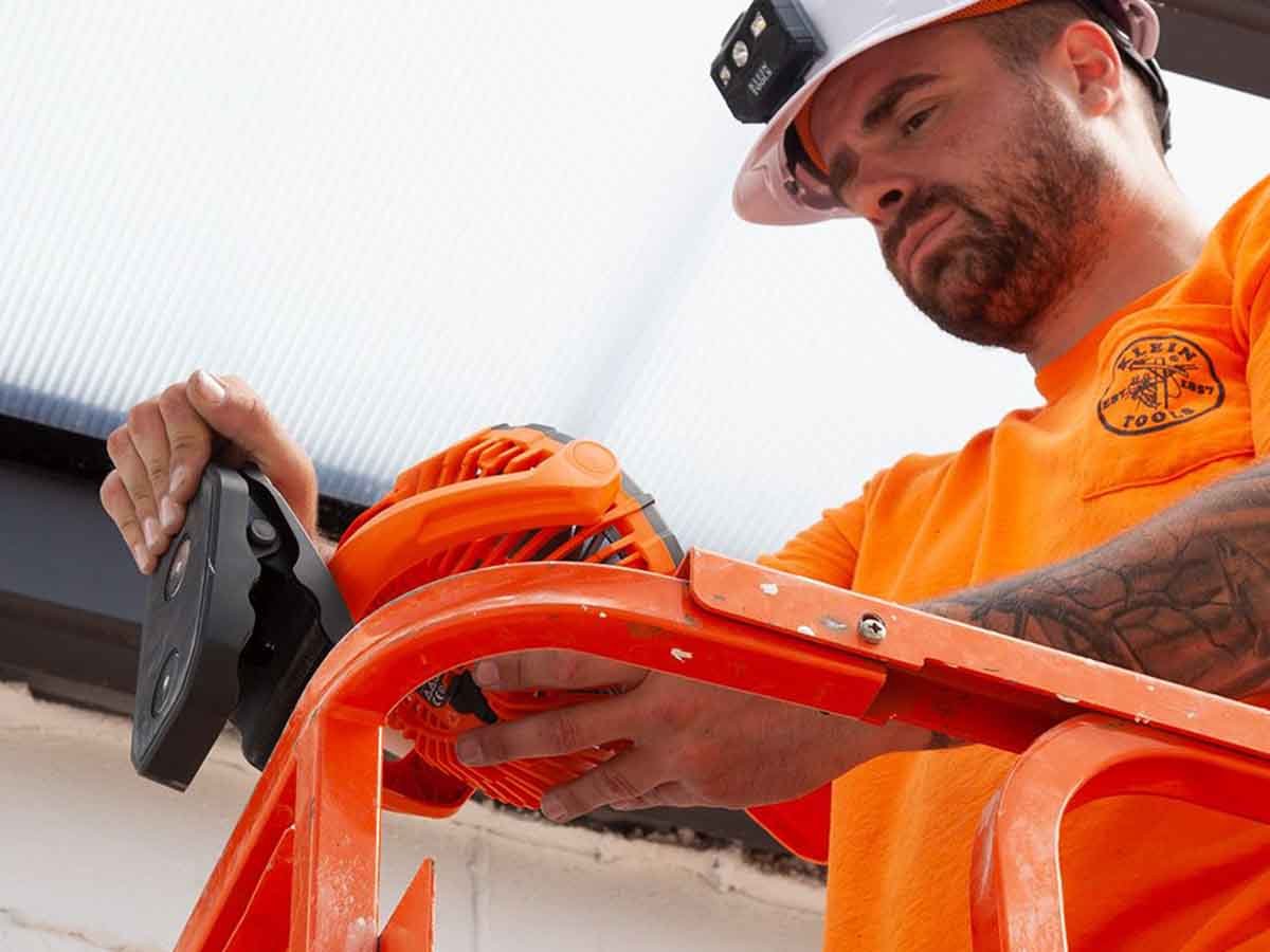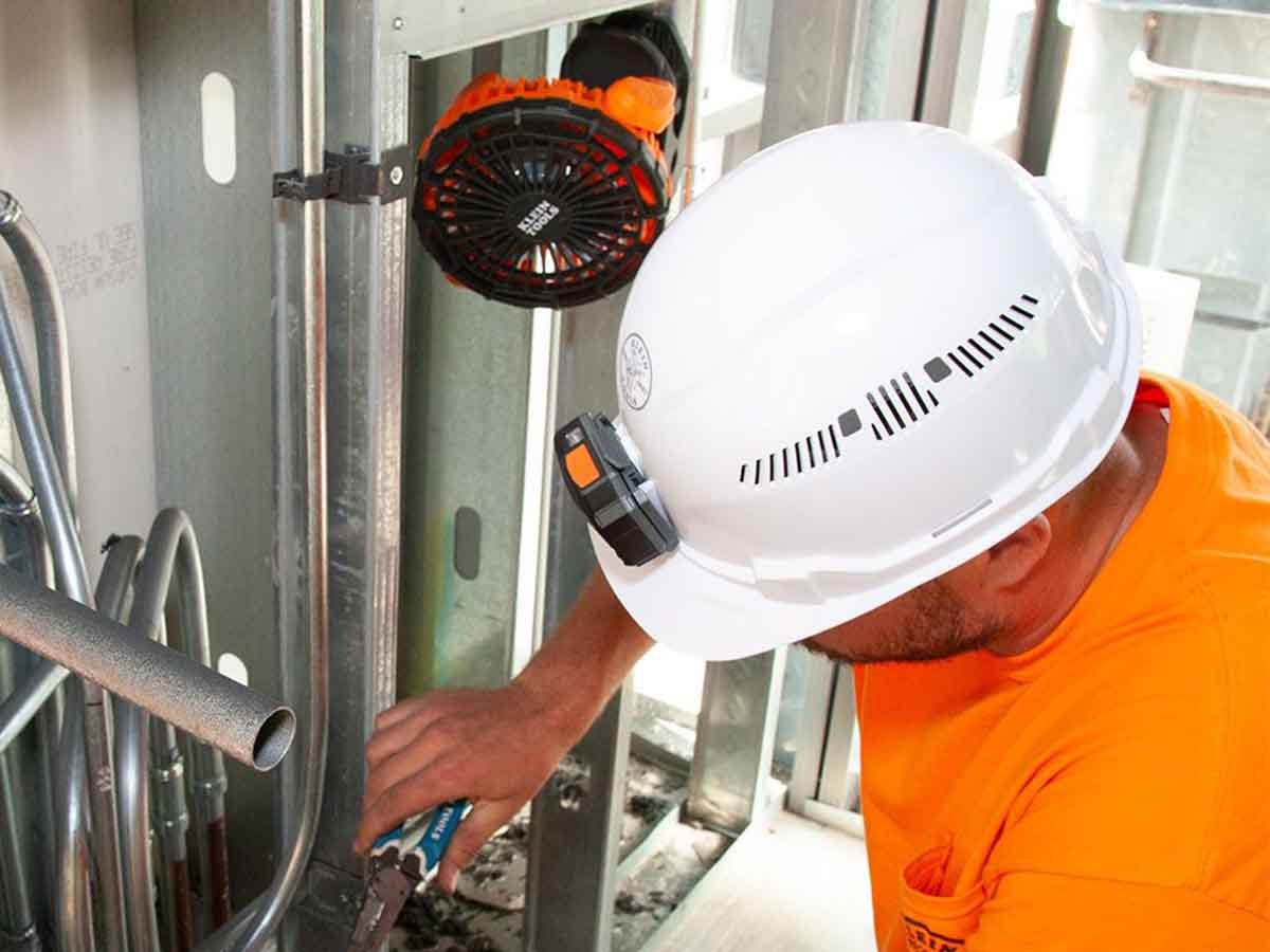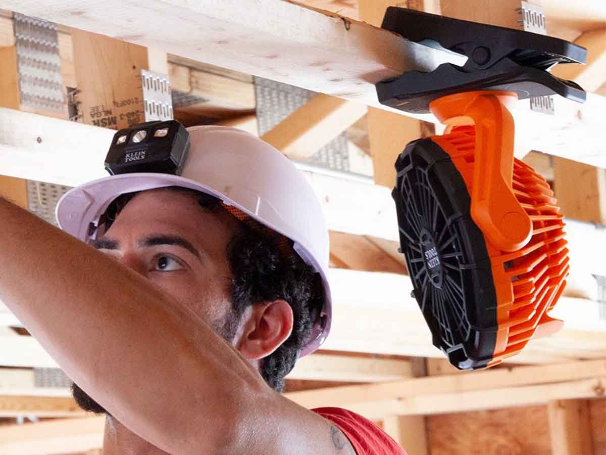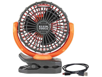 The Klein Tools Rechargeable Personal Jobsite Fan is a small fan ideal for the jobsite while working long hours in the heat. With a wide clamp and magentic base, either orient the fan in an upright position or clamp to a beam or other surface and direct the fan to point towards your space. The arm base rotates 360° so no orientation is out of question.