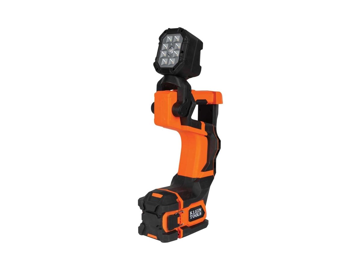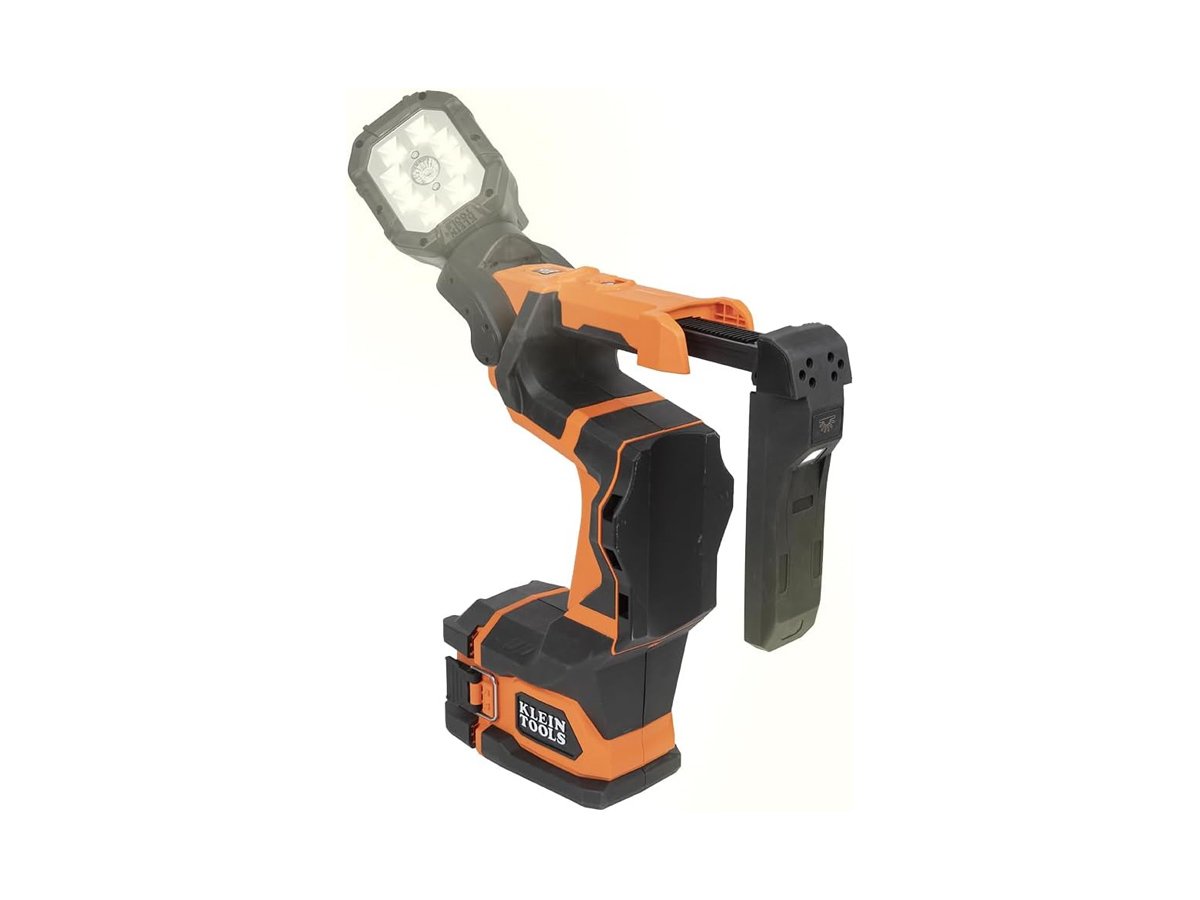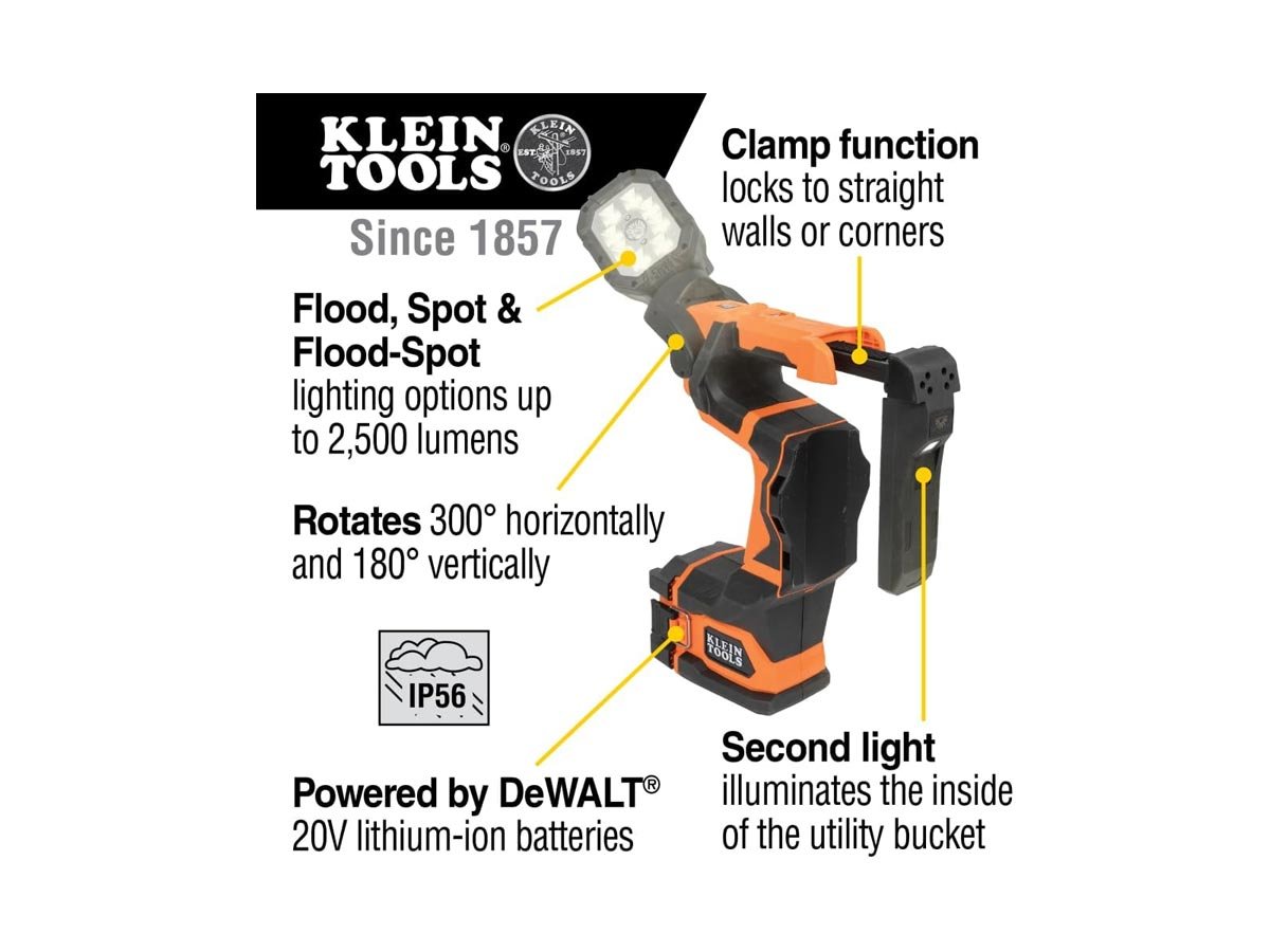 The Klein Tools Utility Light unfolds and is horizontally adjustable for 300 degrees around and vertically adjustable 180 degrees up and down. This design gives you precise aiming ability and maximum light exposure for whatever task you need to handle next. The Klein Tools Utility Bucket Light has a unique, extremely heavy-duty TPE construction and is powered by a 20V/4Ah lithium-ion rechargeable battery pack built by DeWalt. The light is rated to IP56, so is resistant to water, dust, and sand contamination.