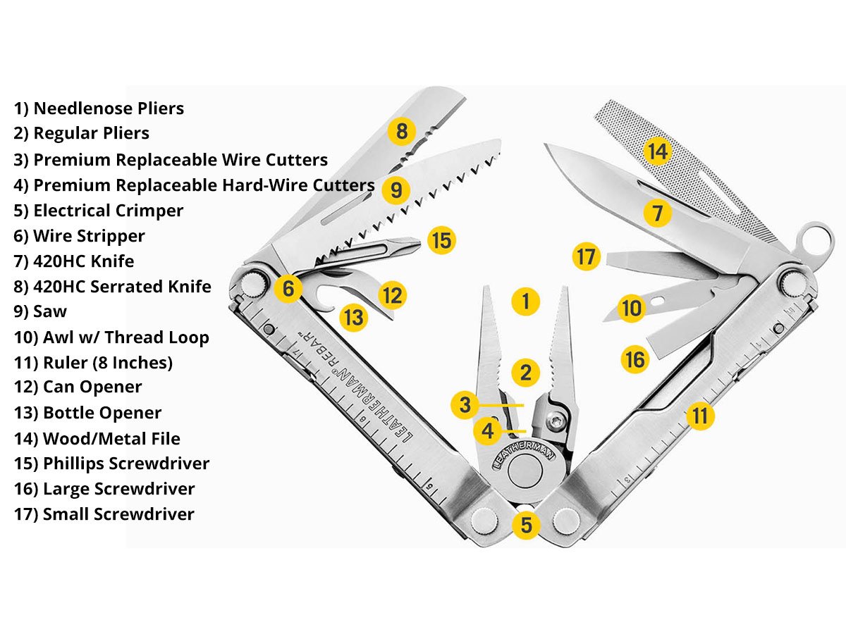The Leatherman REBAR Multi-Tool is a durable and compact set of 17 tools designed for multiple users and professions. Leatherman quality and 100% stainless steel ensures the durability and longevity of every tool. Each tool individually locks into place for safety and security while in use. Package includes a leather sheath for safe and easy carrying.