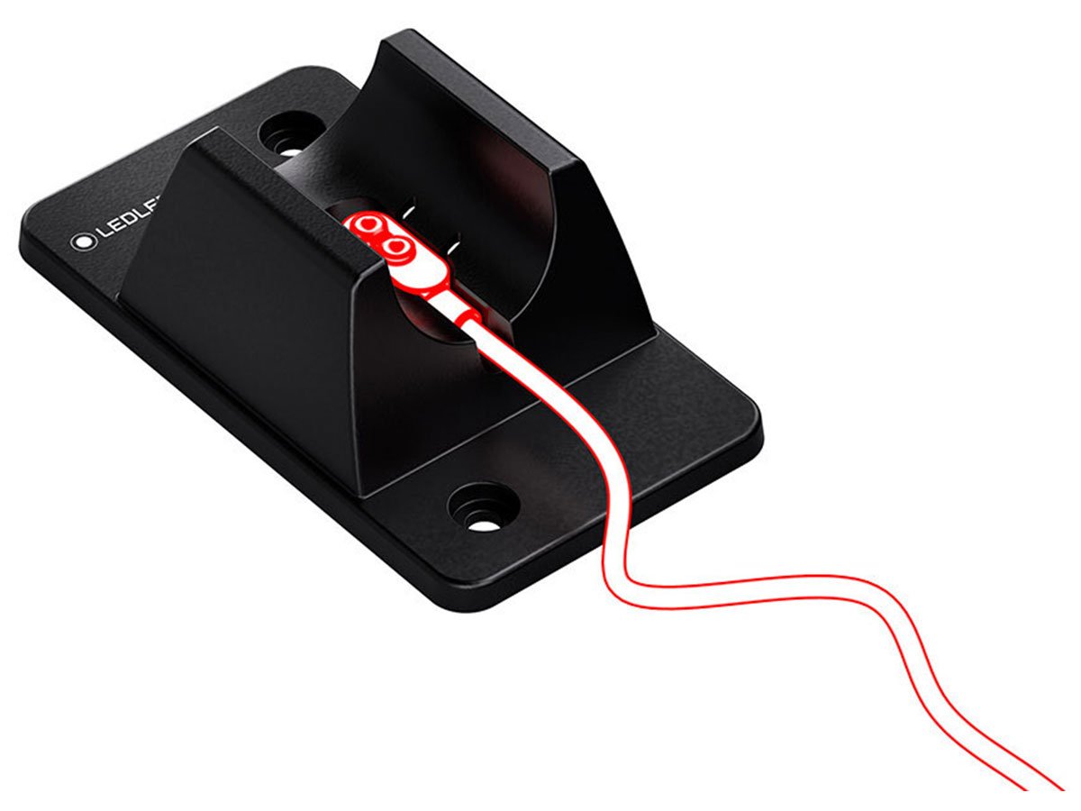 The Ledlenser Wall Mount Type B is a static mount for the Ledlenser P7R series of flashlights. This mount comes with a 47" magnetic charging cord that can be placed within the recess provided to make an automatic charging station. Leave the charging cord out of the mount for optional manual charging and use it as a simple flashlight mount.