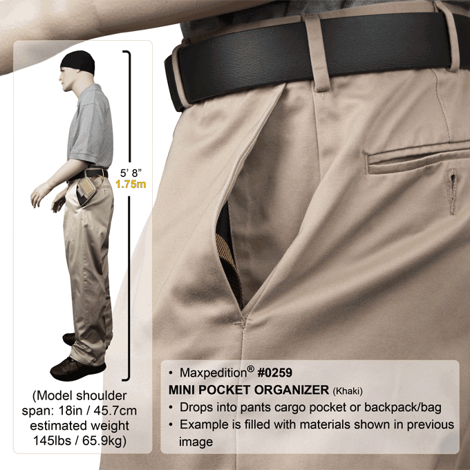 - Drops into pants cargo pocket or backpack/bag