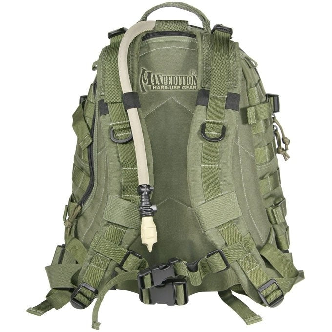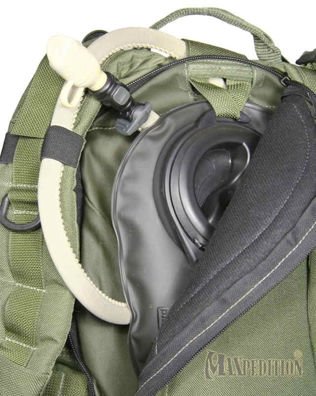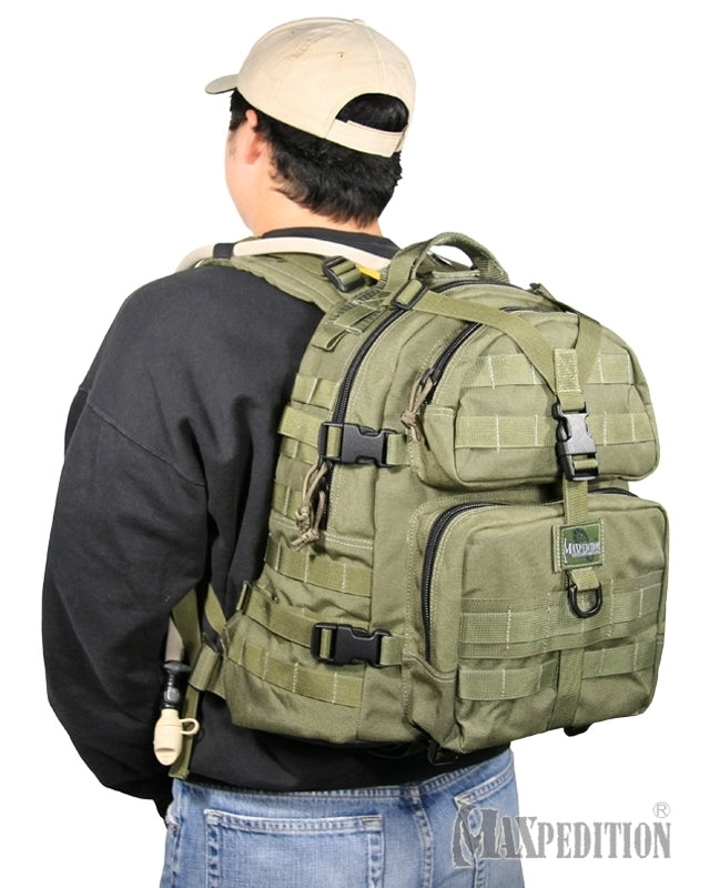 A square with rounded top design, the Condor II can hold over 1950 cu. in. of gear. One removable Y-shaped top strap and four quick-release lateral compression straps secure contents and takes strain off the durable YKK #10 zips. Wide shoulder straps with high breath-ability backing provides superb cooling characteristics. As with all Maxpedition backpacks, the Condor-II's load-bearing capacity can be expanded greatly with other MAXPEDITION modular pockets, added to the backpack's front or side PALS attachment points using Malice Clips. Although we recommend Camelbak hydration reservoirs, our hydration compartment is compatible with most after market hydration systems. The Condor II is available in Black (#0512B), OD Green (#0512G), khaki (#0512K), and Foliage Green (0512F).