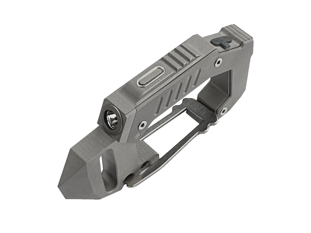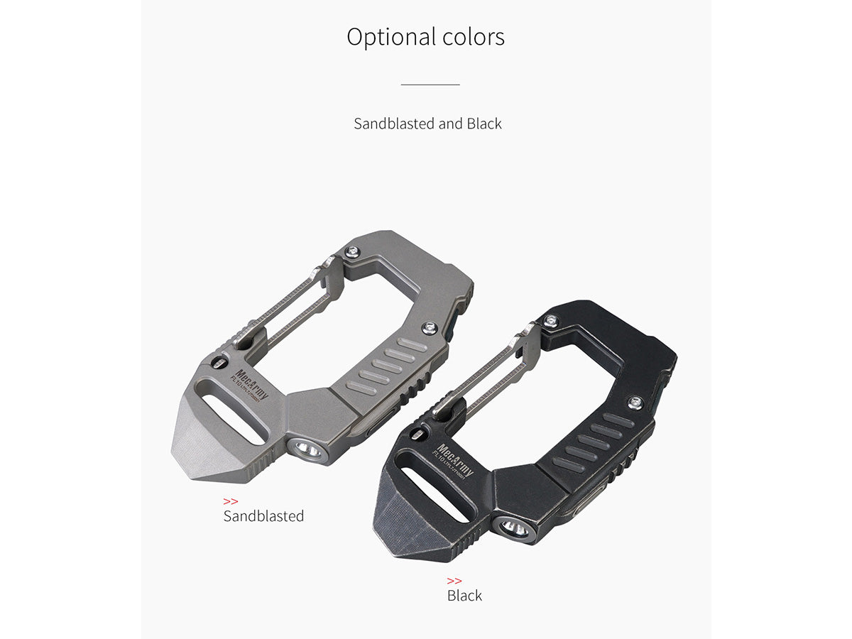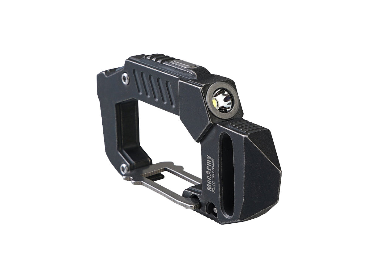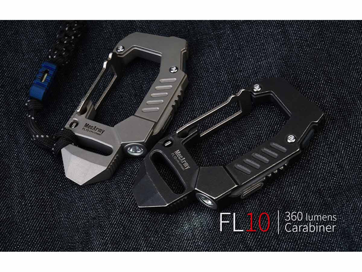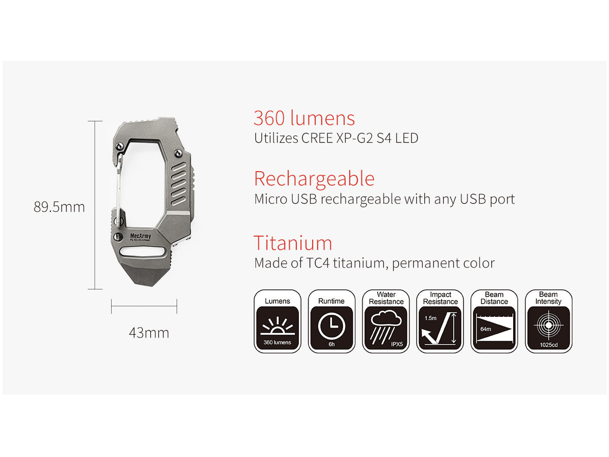 The MecArmy FL10 is a unique combination of a powerful LED flashlight and a rugged, reliable clipping carabiner. Crafted from durable titanium, the carabiner element of the FL10 clips securely to clothing or equipment and makes an excellent key chain, self defense tool and bottle opener. The flashlight portion is surprisingly bright with a 360 Lumen LED output, perfect for use indoors or out. An integrated battery pack powers the light, and can be recharged via USB cable at any computer or wall mounted USB charging port. The FL10 is available in either polished or sandblasted finishes.