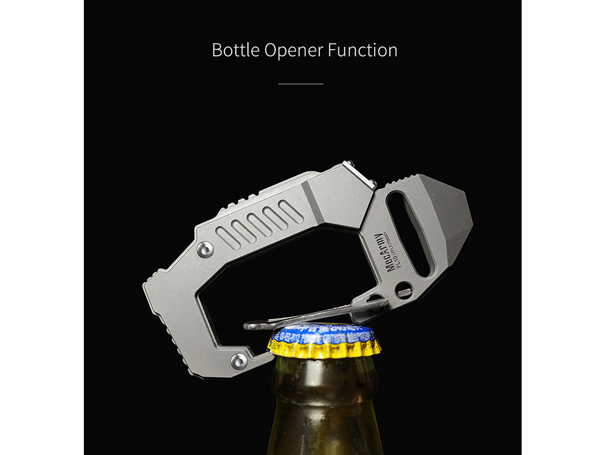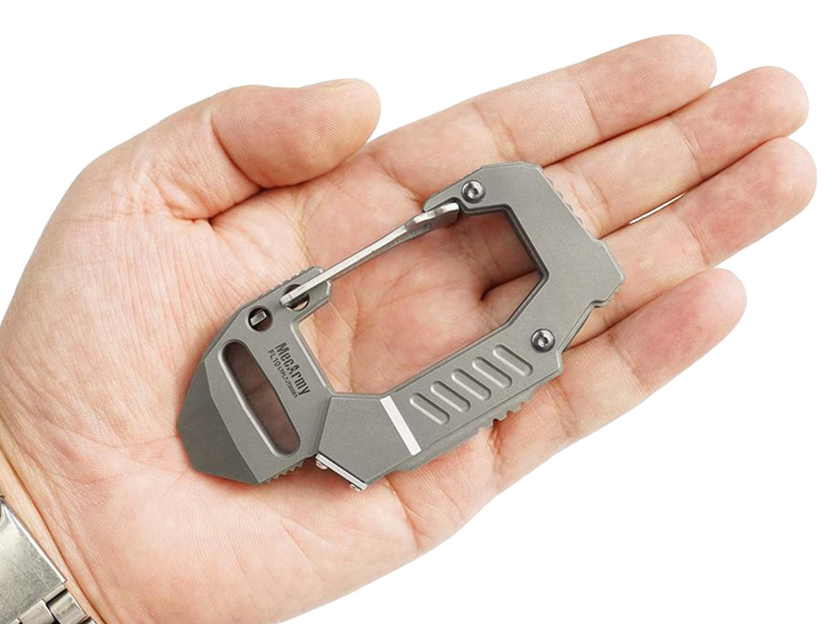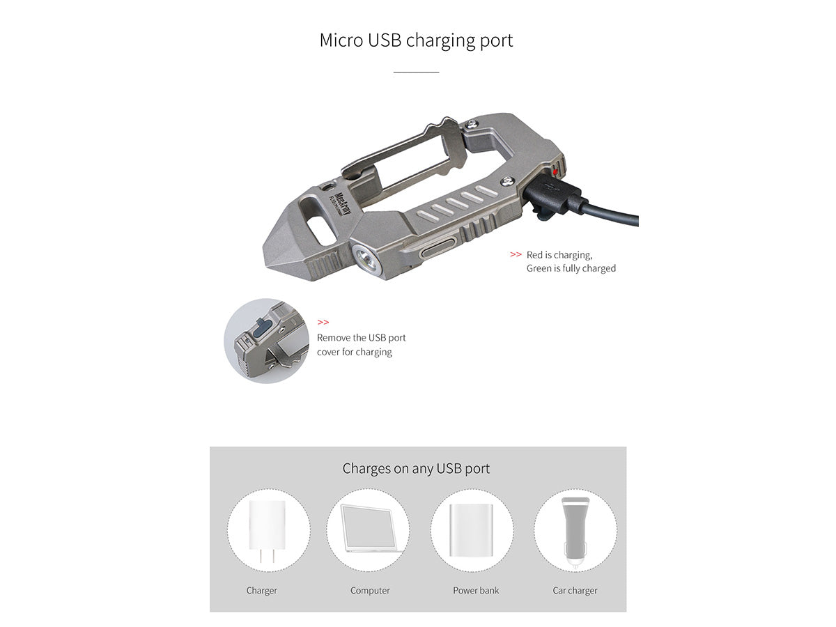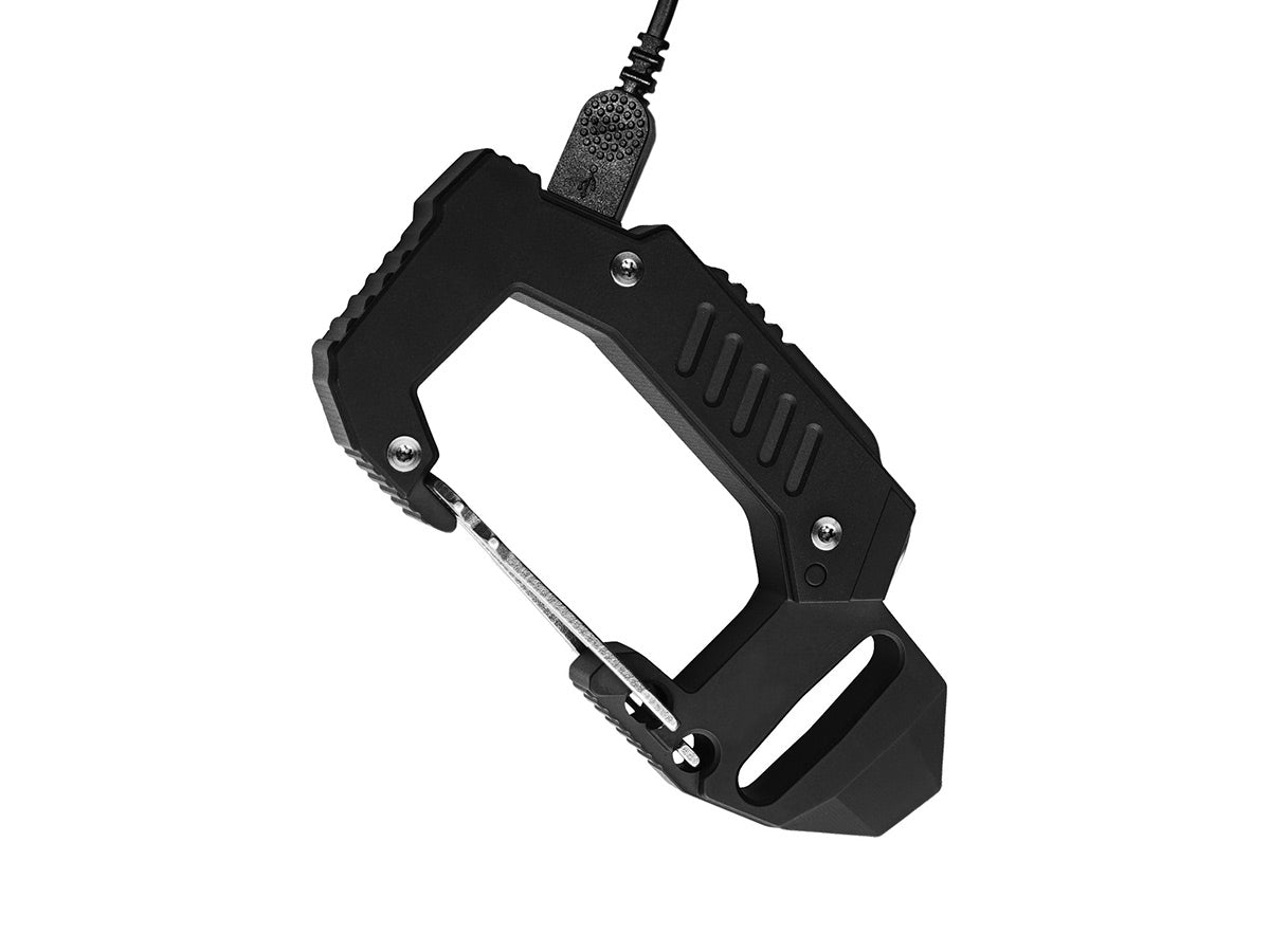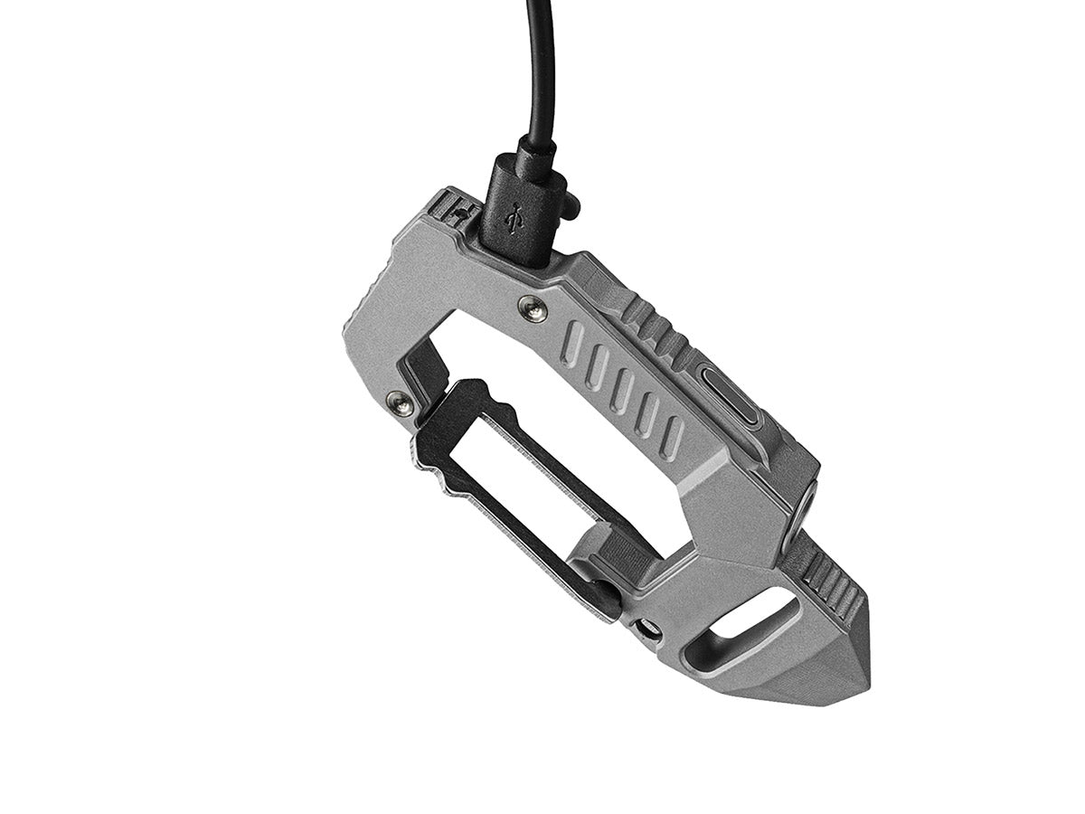 The MecArmy FL10 is a unique combination of a powerful LED flashlight and a rugged, reliable clipping carabiner. Crafted from durable titanium, the carabiner element of the FL10 clips securely to clothing or equipment and makes an excellent key chain, self defense tool and bottle opener. The flashlight portion is surprisingly bright with a 360 Lumen LED output, perfect for use indoors or out. An integrated battery pack powers the light, and can be recharged via USB cable at any computer or wall mounted USB charging port. The FL10 is available in either polished or sandblasted finishes.