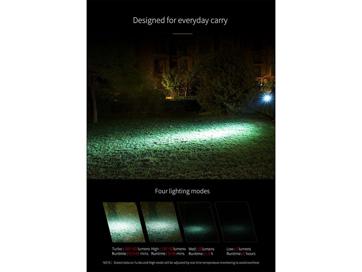 - Turbo 360 Lumens - .5 Minutes (Drops down to 60 Lumens)