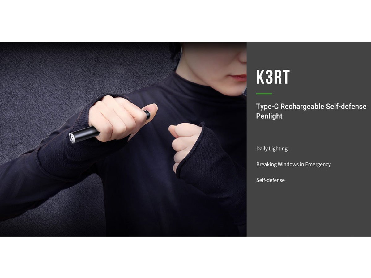 The Nextorch K3RT is a rechargeable penlight that offers self-defense capabilities with its super-hard ceramic tip strike bezel. Its maximum 330 lumen output and multiple brightness modes cover many every day applications from searching for items around the house or in the car, walking at night, or reading. A compact design makes it easy to take with you on the go, and an attached pocket clip give you multiple options for carry. The penlight is USB-C rechargeable so you dont have to keep swapping out dead batteries, and conveniently remembers your last used mode when you turn it on.