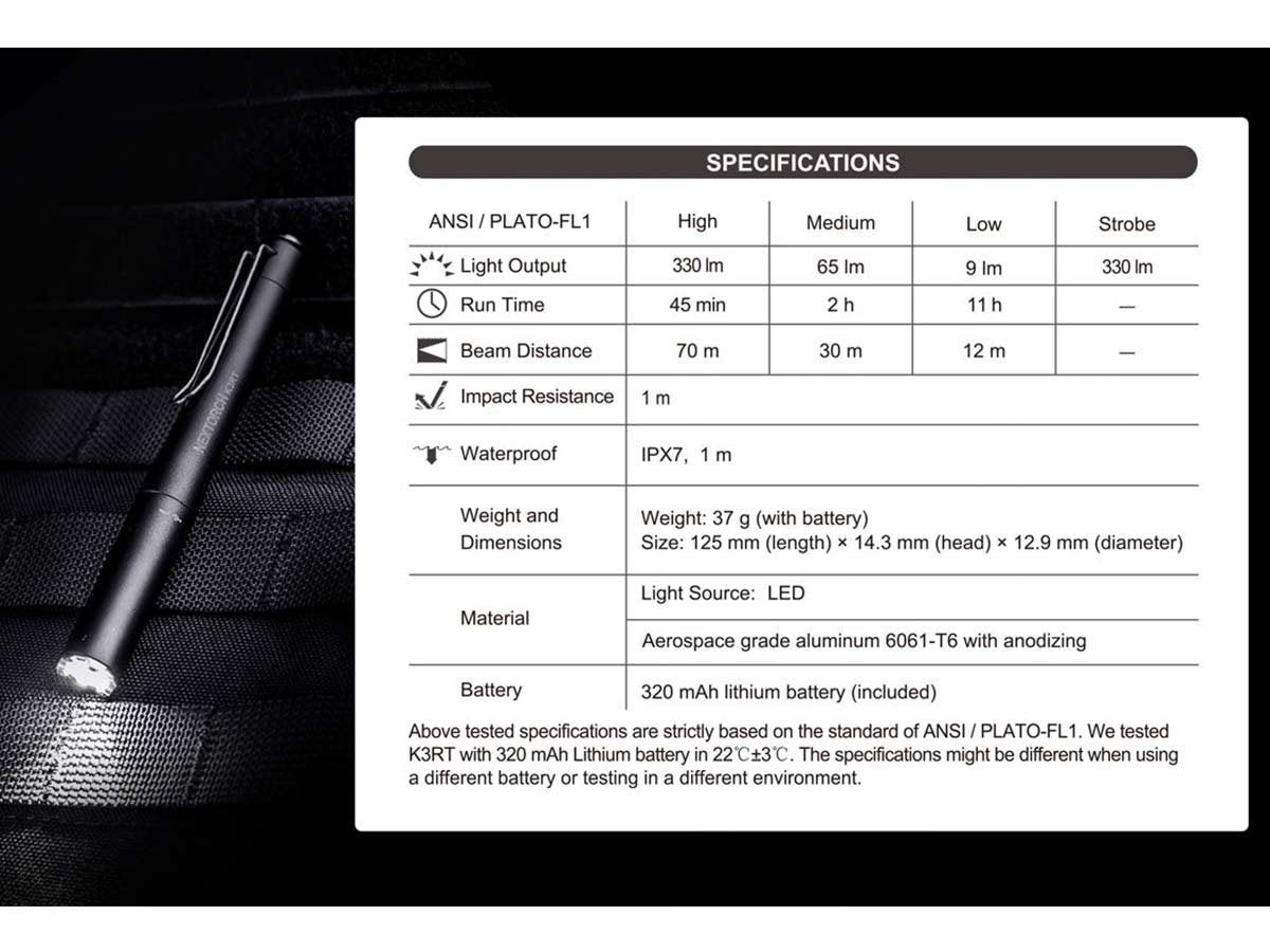 Nextorch K3RT USB-C Rechargeable LED Penlight - CREE XP-G3 - 330 Lumens - Uses Built-in 320mAh Li-ion Battery Pack