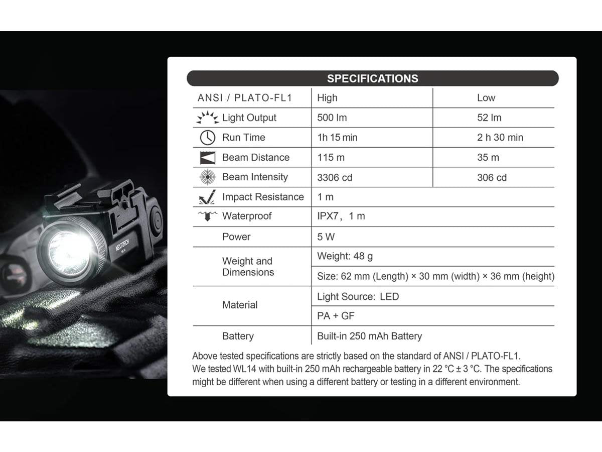 Nextorch WL14 USB-C Rechargeable LED Weapon Light - OSRAM P9 - 500 Lumens - Uses Built-in 250mAh Li-ion Battery Pack