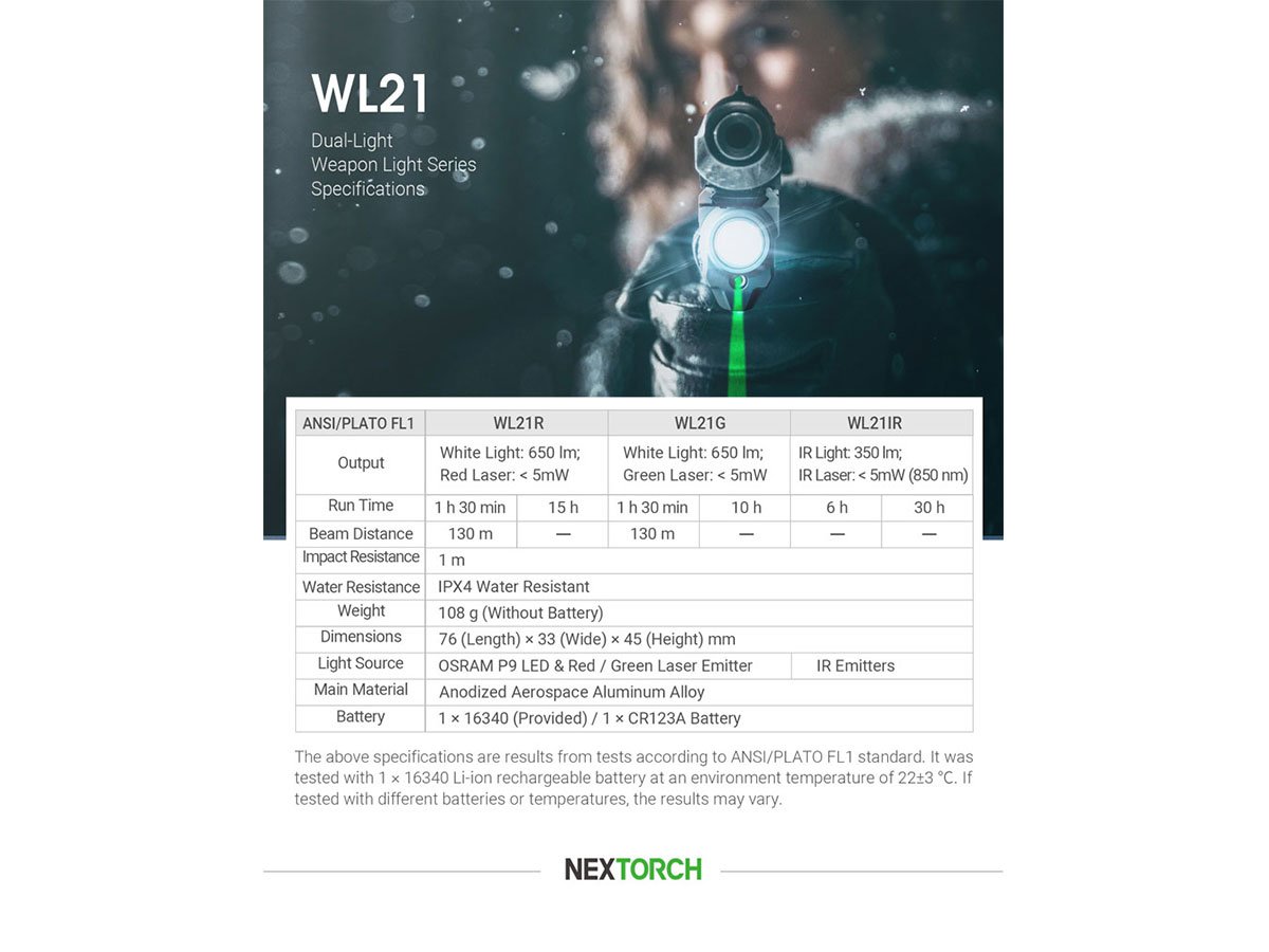 The Nextorch WL21R and WL21G Weapon Lights are dual-lights with a main white LED and a choice of either a red or green laser emitter. Each laser color has its own benefits for aiming accuracy and personal preference, so Nextorch lets the user choose. The Nextorch WL21IR Weapon Light outputs both an infrared LED and laser emitter for invisible lighting that best secures low-profile positioning out in the field. All options have an emitter with an output of <5mW that can assist in aiming or sighting.