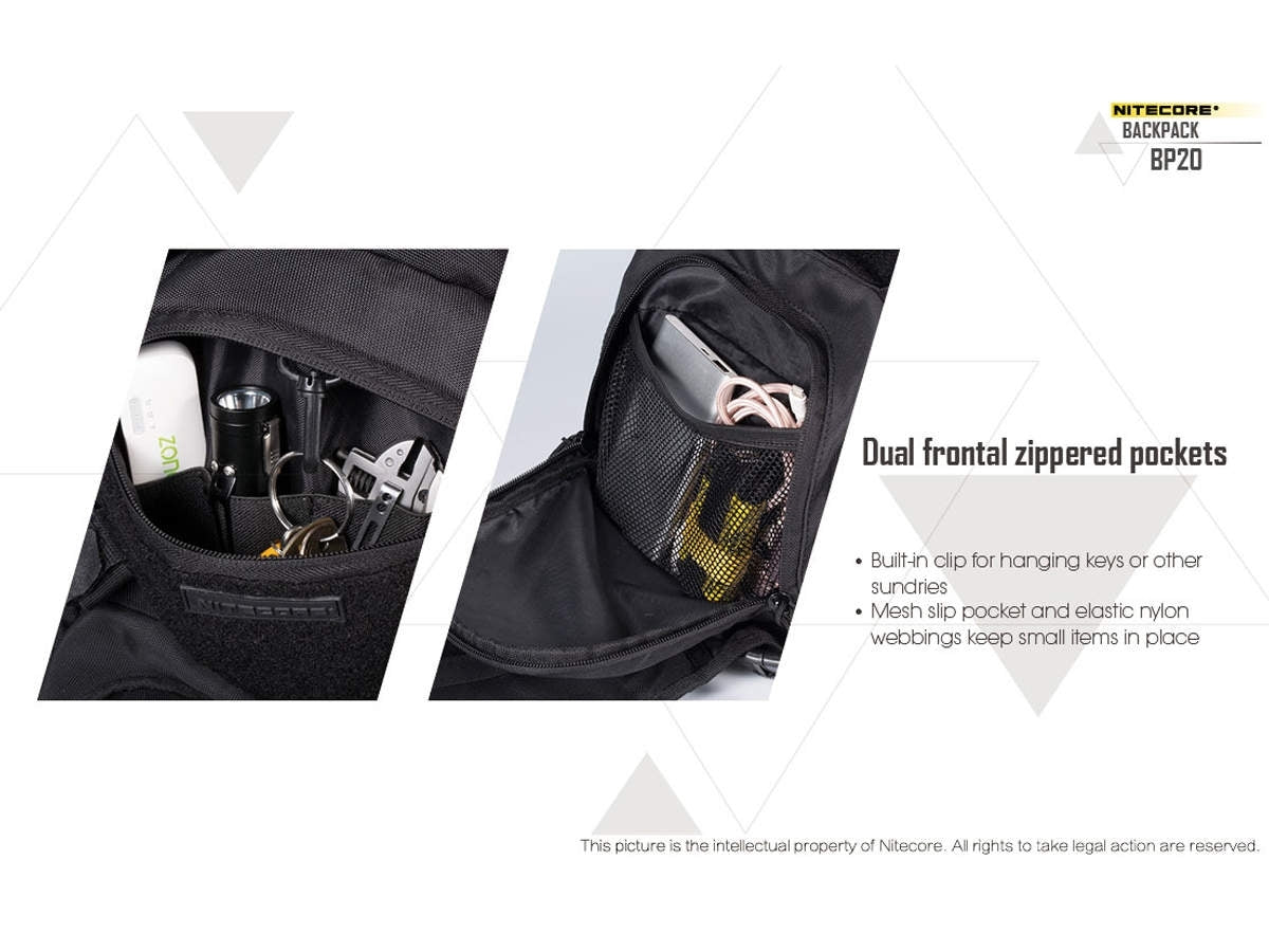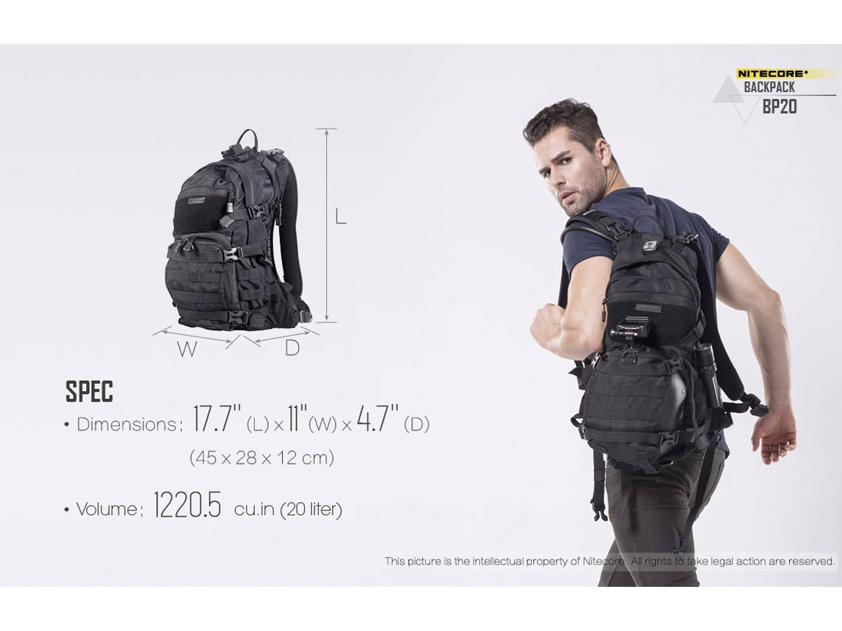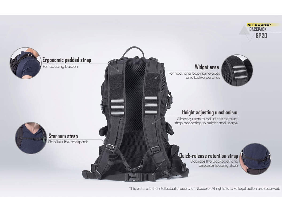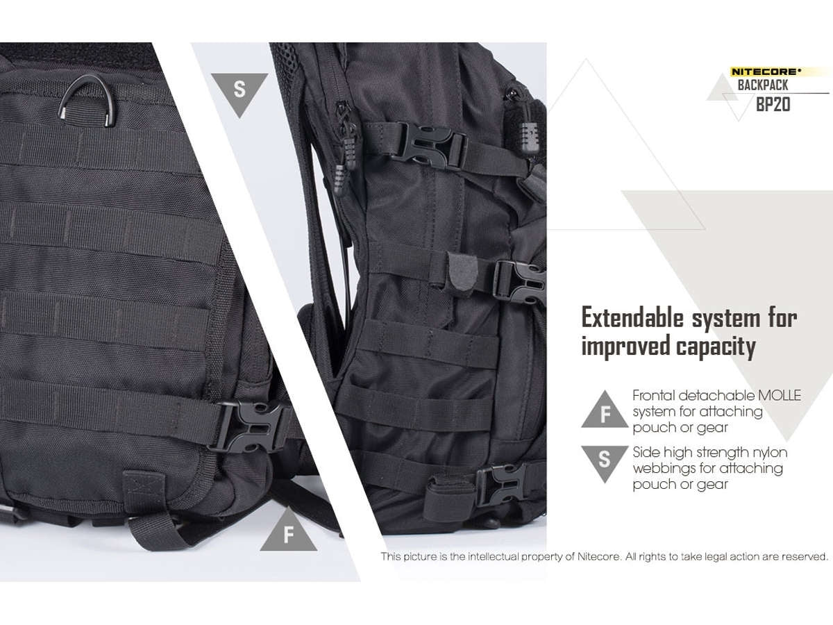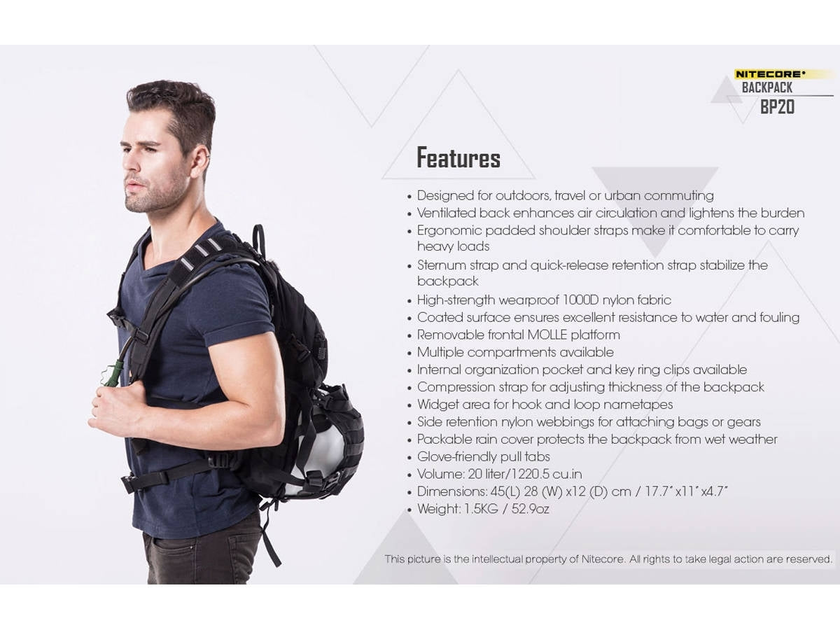 The user can choose how much your bag can hold with the convenient compression straps on its side, which allow you to adjust the bag's thickness. Both the sides and the front of the backpack feature a tactical MOLLE system for attaching additional bags, pouches or gear when the space in its trio of compartments just isn't enough. Spacious, durable, and comfortable, the Nitecore BP20 Backpack is the ultimate pack for any user!