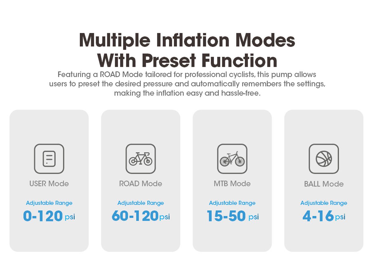 - Air inflation range of 1 - 120 psi to reinflate bike tires!