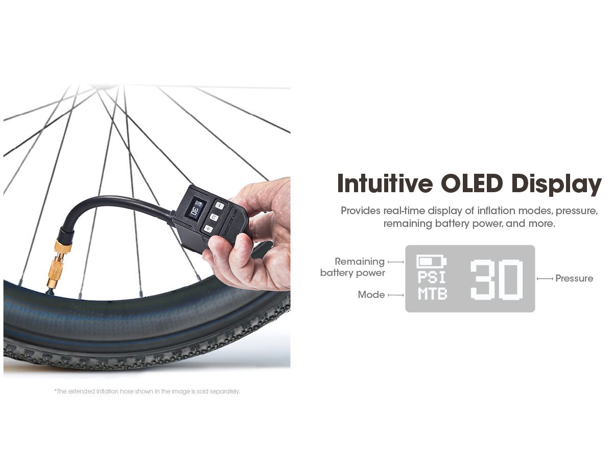 With its OLED display, users can easily keep track of psi output and mode for precise control. Have a habit of overinflating tires? No worries, because its built-in sensor cuts off air output when the tire is fully inflated! It's also easy to adapt this pump to any tire type because you can switch between Schrader and Presta valves without any extra tools. Just swap out the cap, seal, pillar, and base by hand.