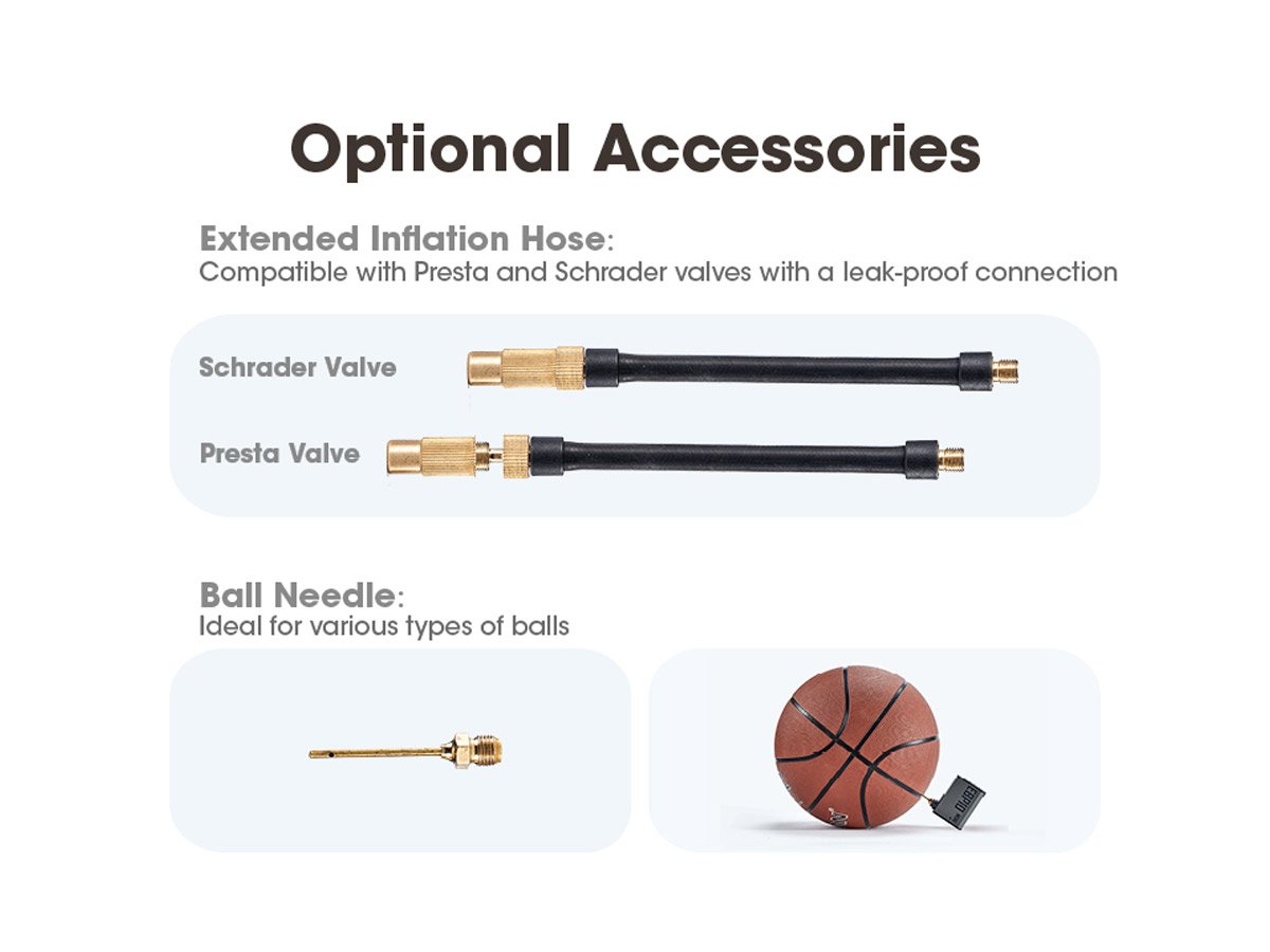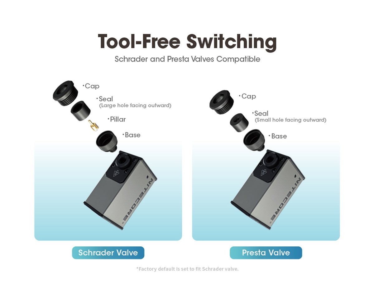 - » Compatible with Presta and Schrader valves thanks to customizable nozzle
