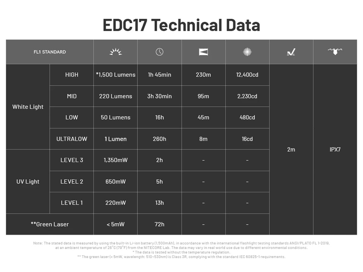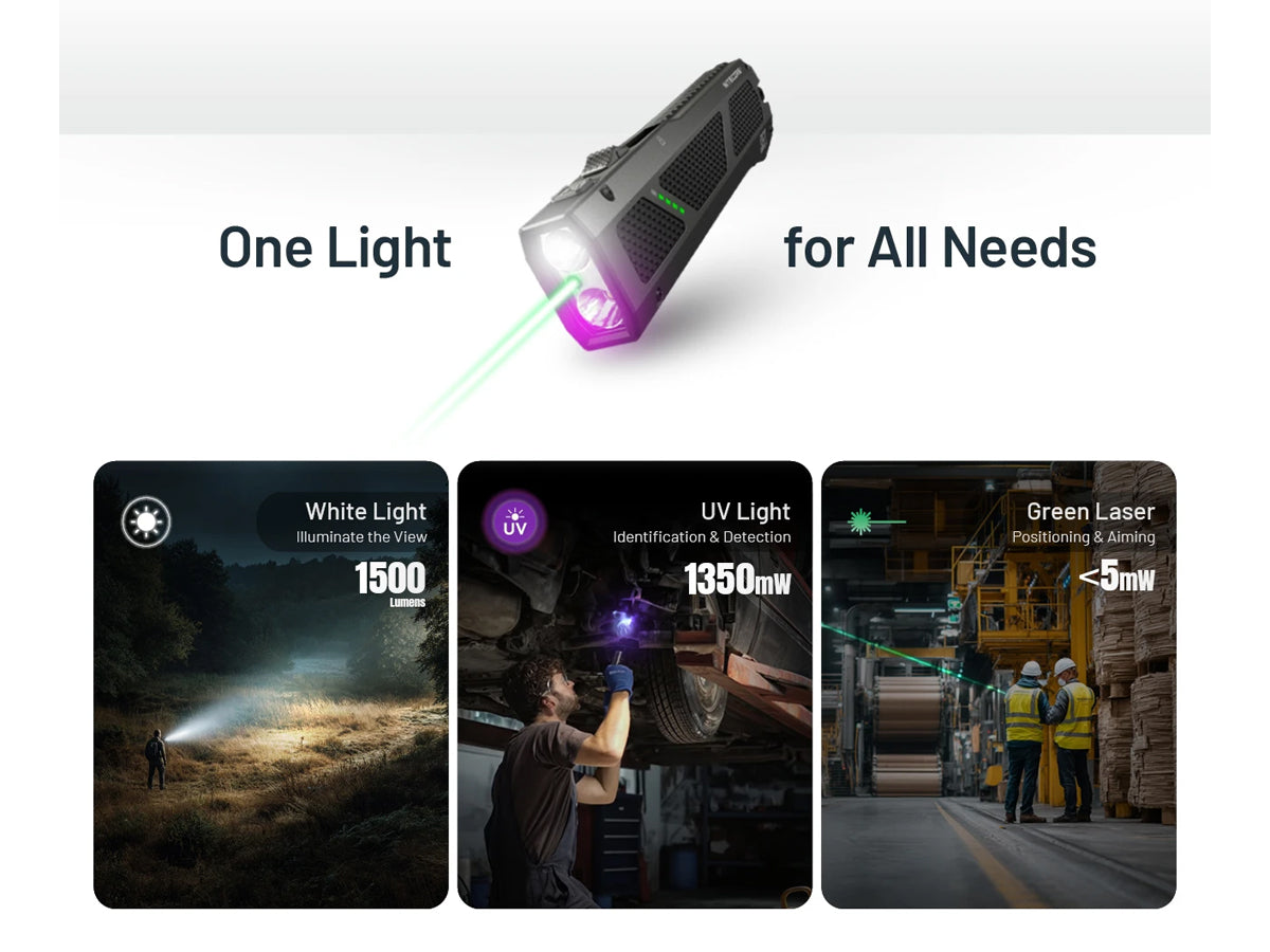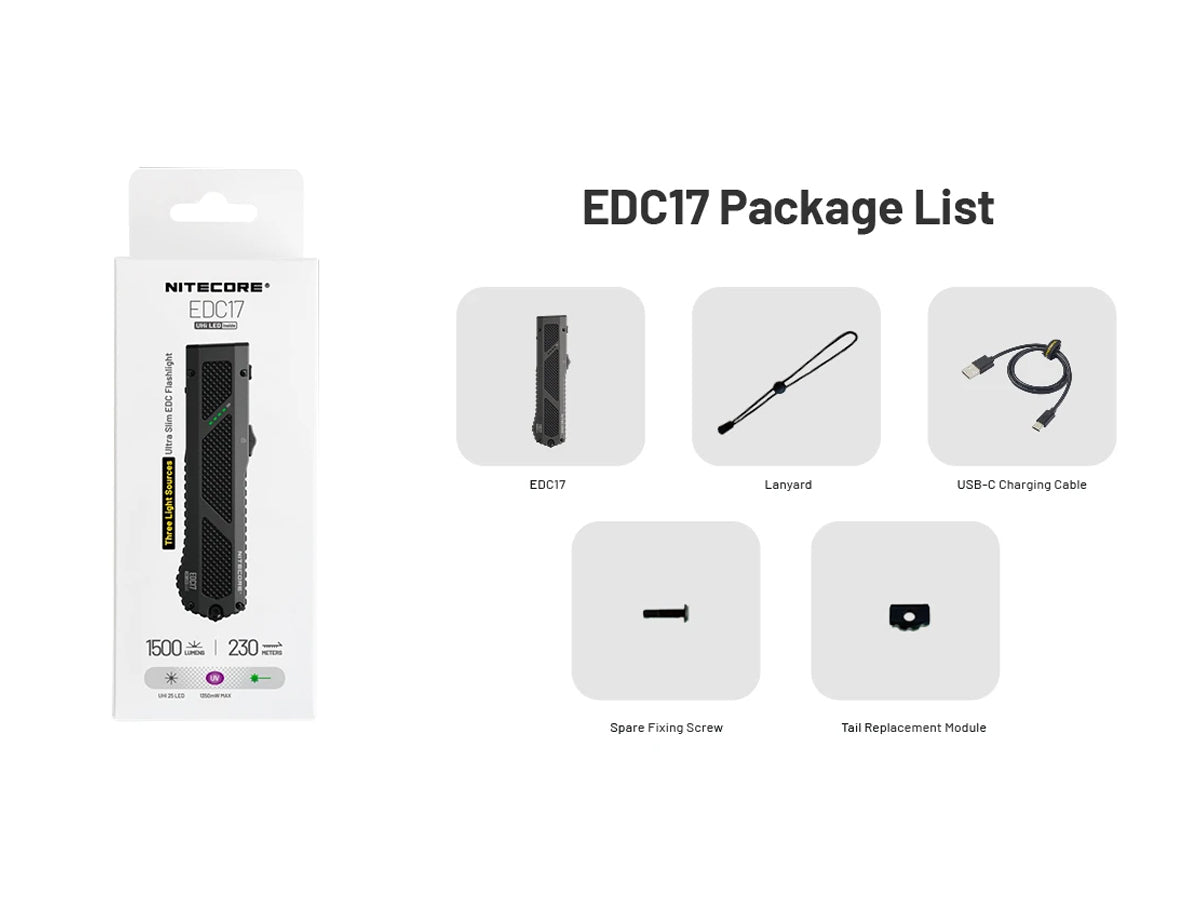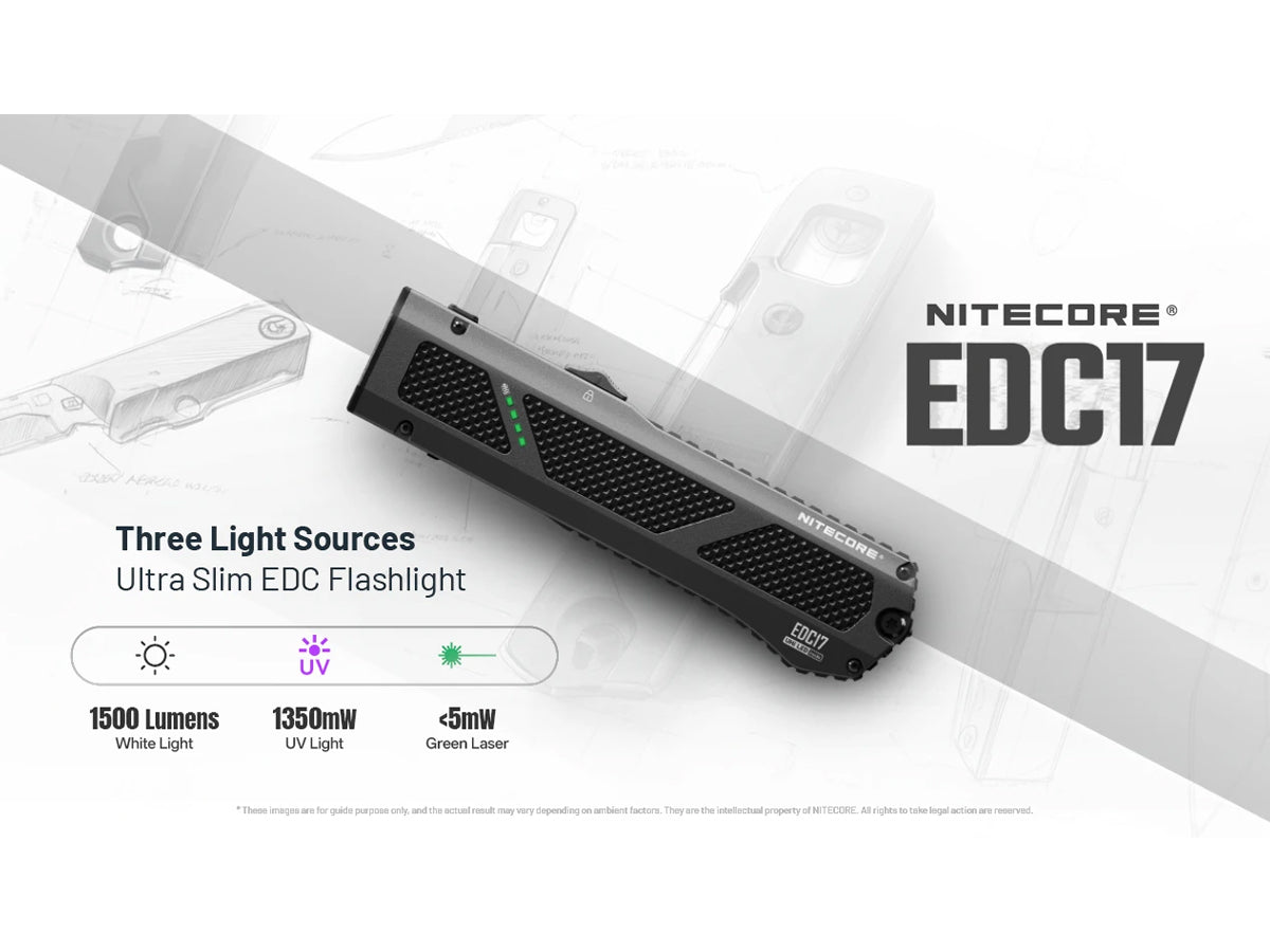When you need one flashlight that does it all, grab the Nitecore EDC17! It's an ultra-slim flashlight equipped with powerful white light, ultra-violet, and green laser emitters to give you an all-in-one illumination solution. White light modes reach 1,500 lumens with a throw over 250 yards perfect for spotting outdoors or illuminating the darkest spaces. The UV light highlights previously invisible details, key for auto maintenance, verifying documents, and much more! The EDC17 even has a hi-viz green laser pointer for more in-depth presentations and exciting pet playtimes. 18% more compact and 40% lighter than an iPhone, it's the perfect EDC lighting tool.