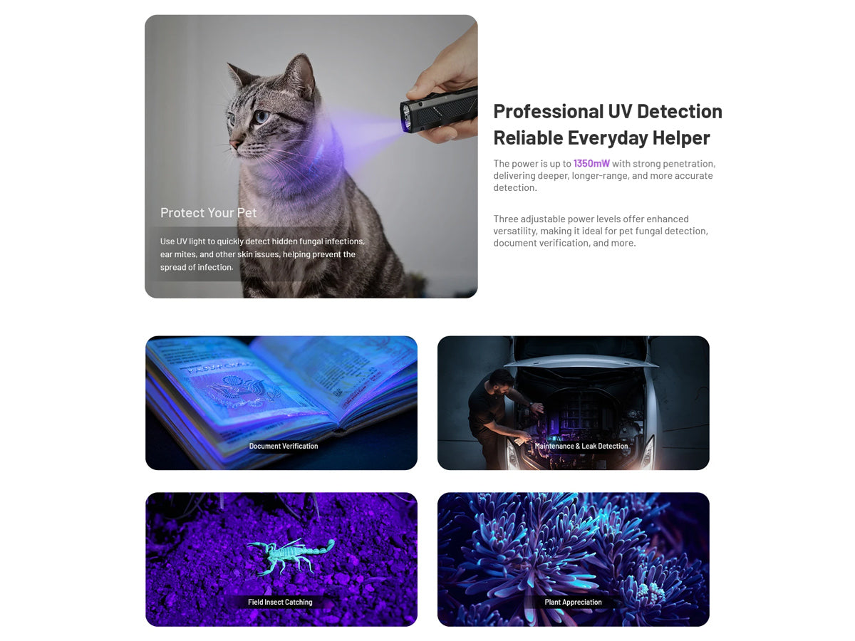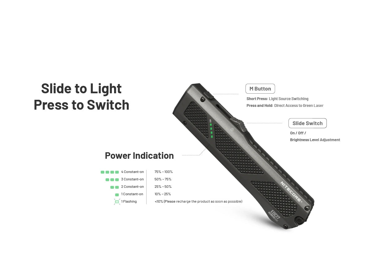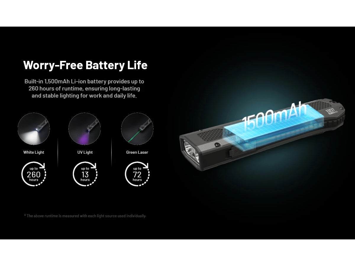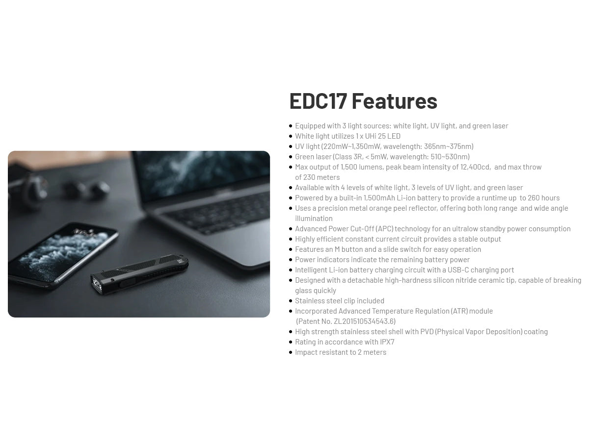 When you need one flashlight that does it all, grab the Nitecore EDC17! It's an ultra-slim flashlight equipped with powerful white light, ultra-violet, and green laser emitters to give you an all-in-one illumination solution. White light modes reach 1,500 lumens with a throw over 250 yards perfect for spotting outdoors or illuminating the darkest spaces. The UV light highlights previously invisible details, key for auto maintenance, verifying documents, and much more! The EDC17 even has a hi-viz green laser pointer for more in-depth presentations and exciting pet playtimes. 18% more compact and 40% lighter than an iPhone, it's the perfect EDC lighting tool.