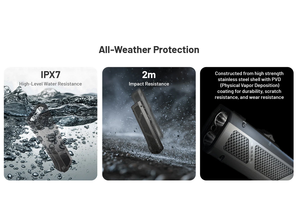 Featuring a stainless steel frame with PVD coating, the EDC17 has a distinct high-strength construction, for extreme durability at work, while hiking trails, or even just in the backyard. Highly resistant to impacts and wear from daily use, the light is also IPX7 stormproof so it works absolutely everywhere, at any time. On the tail, you'll find a silicon nitride ceramic bead tip that can break glass, keeping you prepared for emergency escape and rescue scenarios. The bead is rounded so it won't scratch valuables in a pocket or bag, but you can also freely remove it and replace it with the provided flat tail module. The durable, glass-breaking light that saves the day - the Nitecore EDC17 lights your way!
