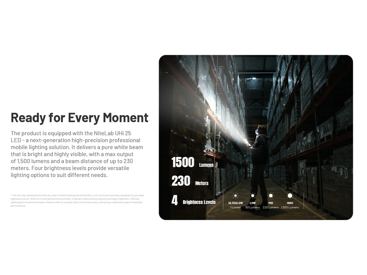 - » Outfitted with NiteLab Ultra-High Intensity LED and precision metal OP reflector to create ideal daily-use beam pattern
