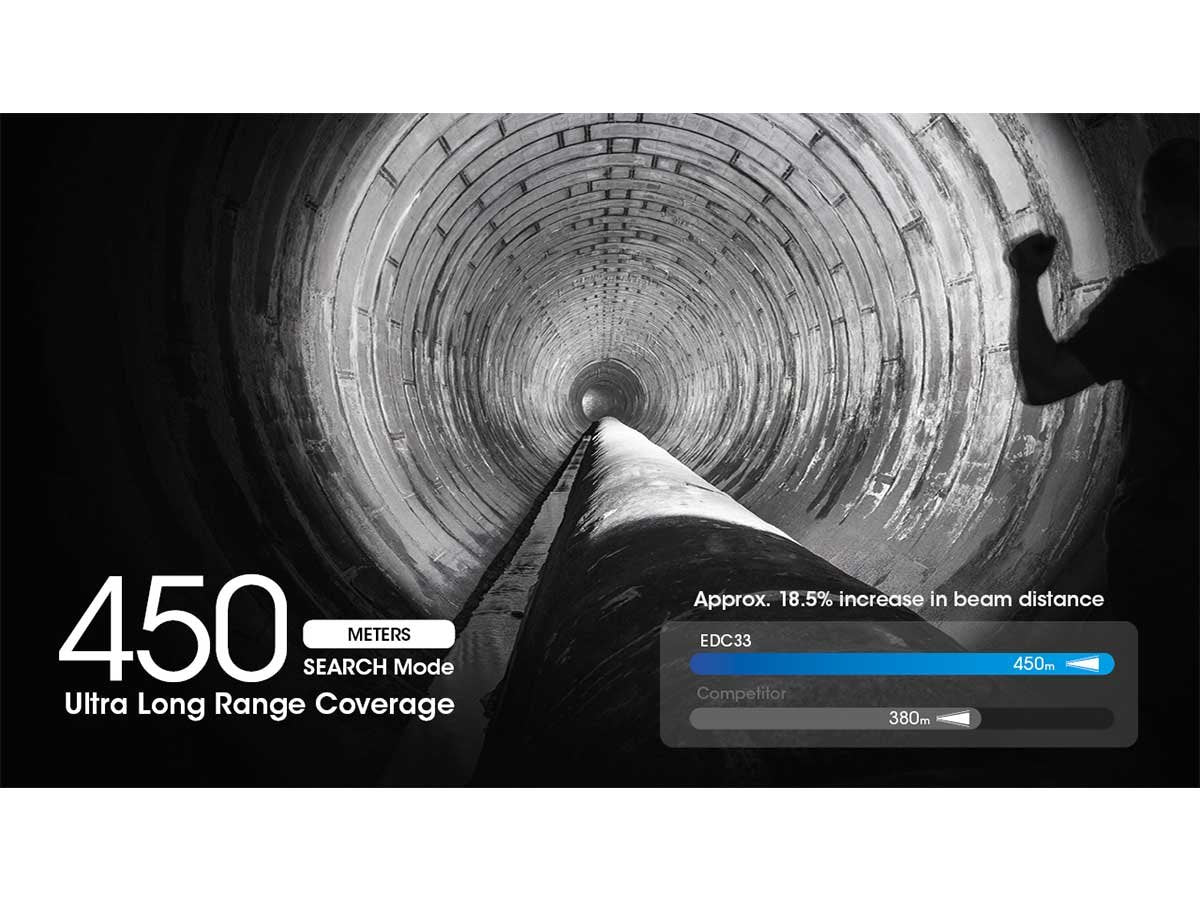The UHi LED "LUMIN SHIELD" floodlight mode provides momentary brightness in a flash! Using all 9 LED cores, the EDC33 emits 4,000 lumens, bright illumination to light up the night. Simply full press and hold on the tactical tail switch to activate a momentary light wall as fast as lightning so you can prioritize self-defense capability out in the field. Alternatively, half press the tail switch for the "SEARCH" mode, offering quick access to spotlight output with a far-reaching throw of 450 meters that's perfect for late-night expeditions!