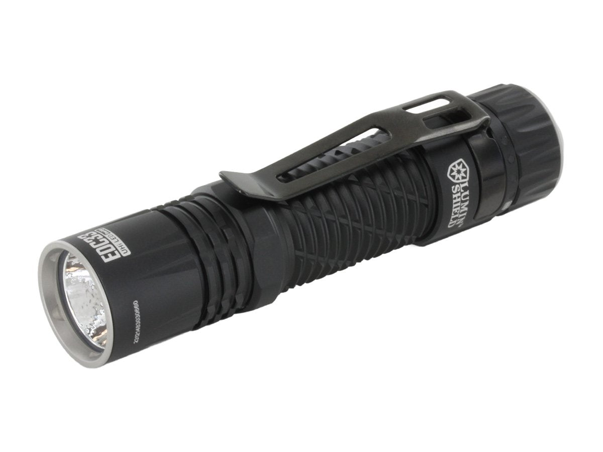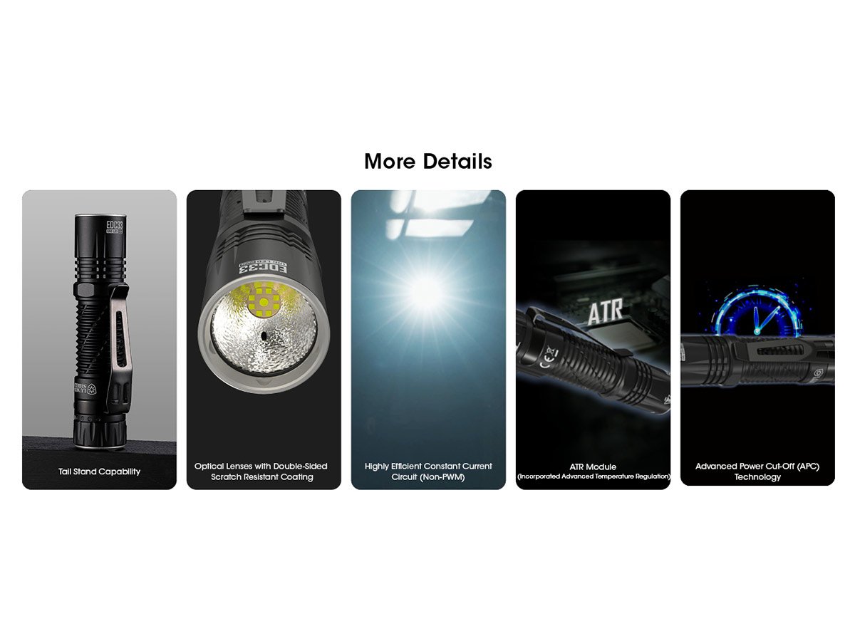 Note: * Data is measured using the built-in lithium-ion battery under laboratory conditions. The EDC33 features advanced power cut-off (APC) technology and will regulate power consumption to save battery and prioritize the safety of you and your flashlight.