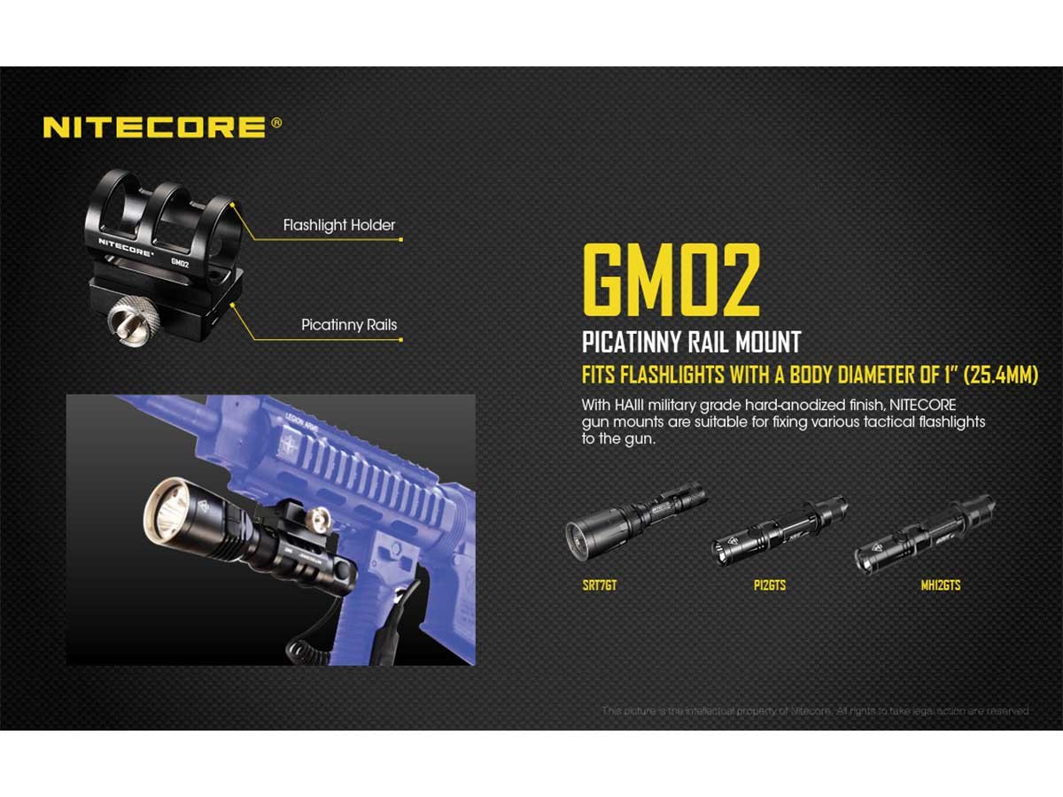 The Nitecore GM02MH flashlight holder is a weapon mount that comes with a newly designed magnetic system. Easily attach the mount to your weapon of choice with the strong magnetic base that will hold your flashlight in place and securely attached to your firearm. The GM02MH fits flashlights with a body diamter of 1" (25.47mm) or is compatible with the Nitecore SRT7GT, P12GTS, or the MH40GTR. Made with an HA III military grade hard-anodized finish, this is the ultimate mount for tactical lights.