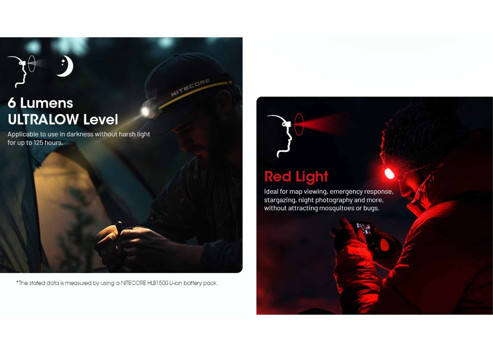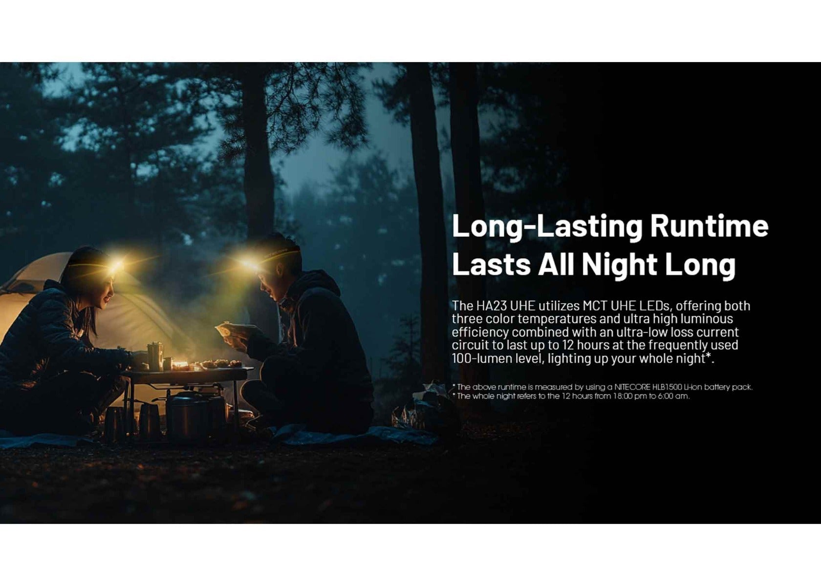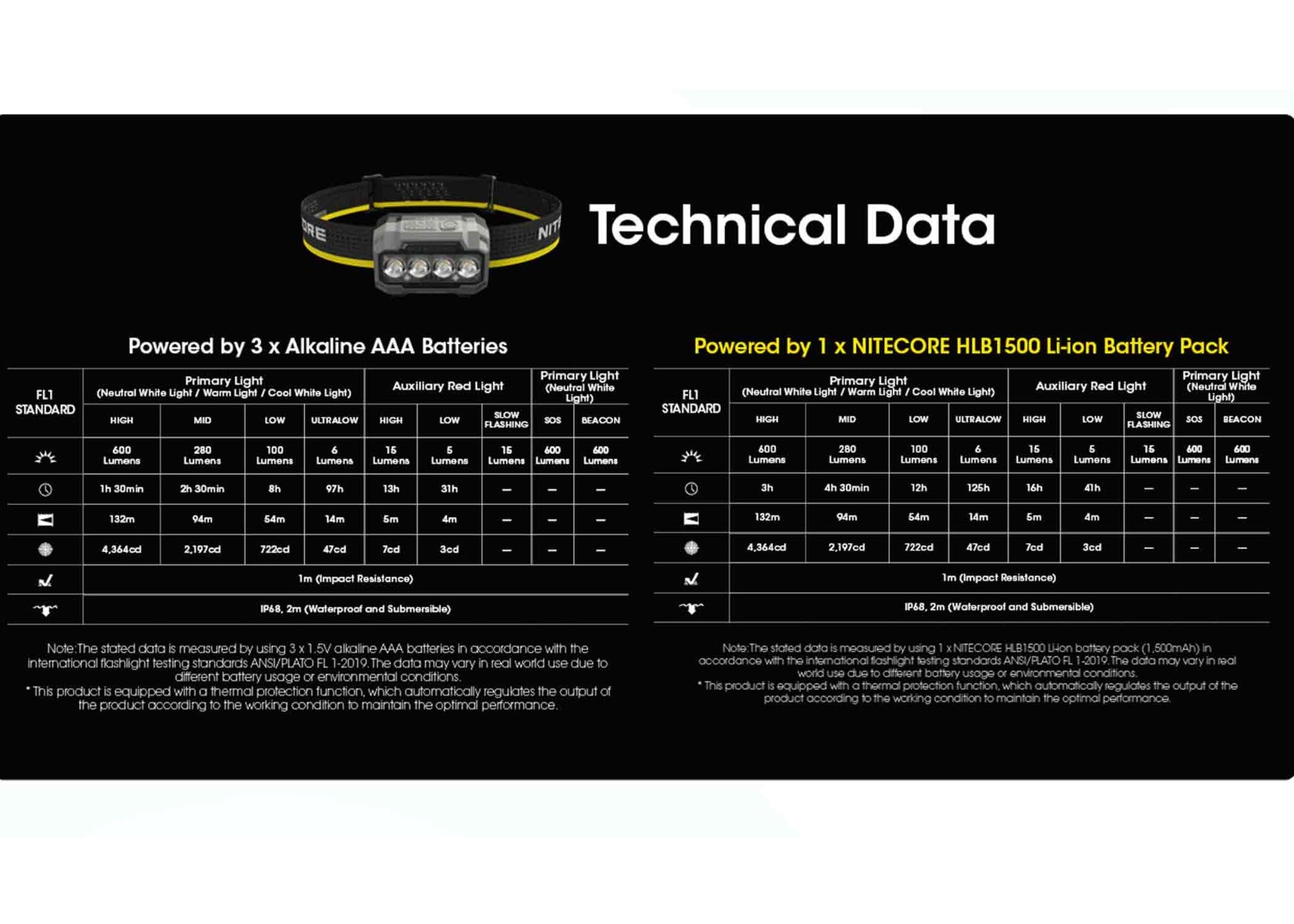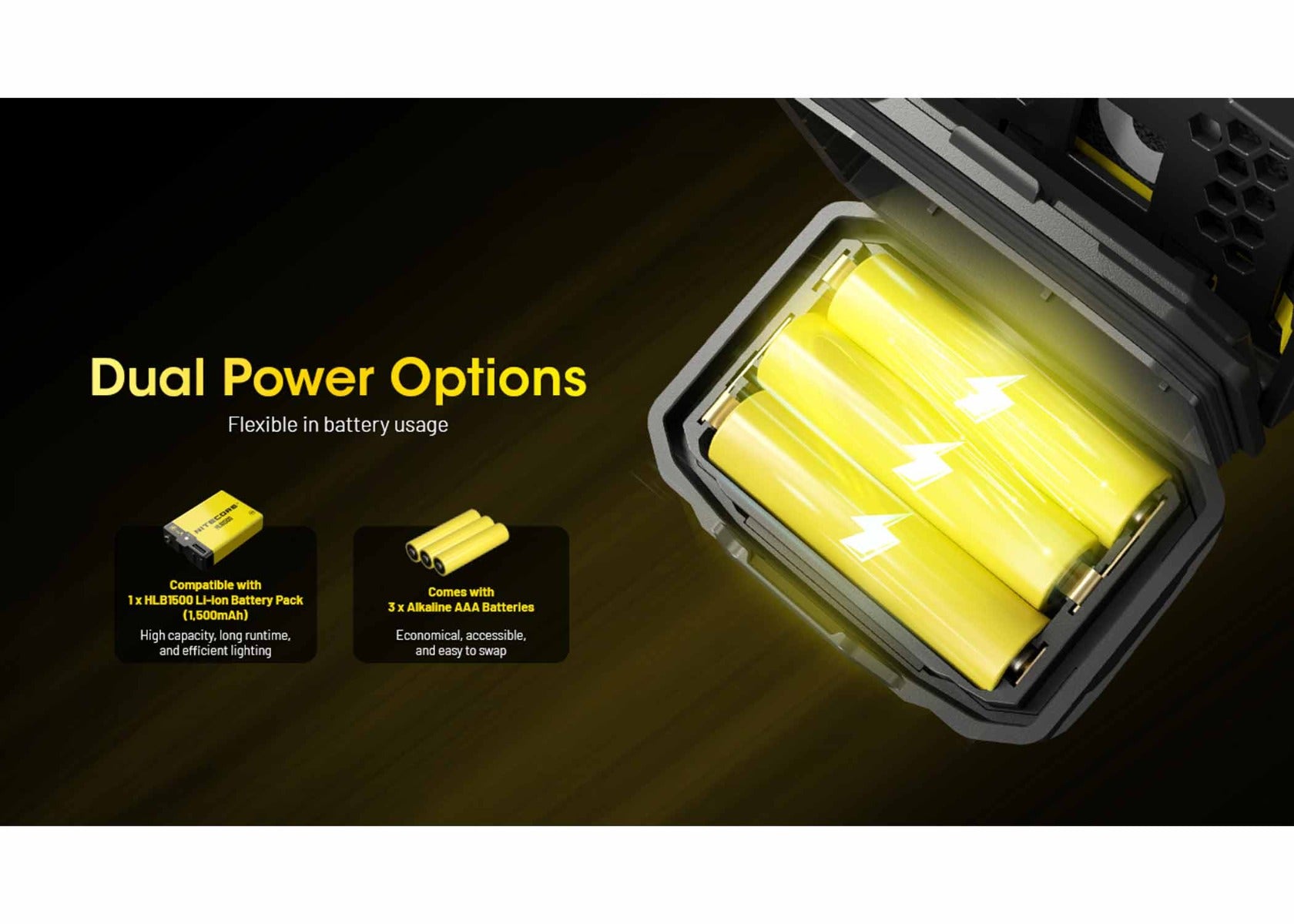 Never worry about losing light with the HA23 UHE. It uses 3 x Alkaline AAA batteries to deliver runtimes of up to 97 hours on ultralow, while red light can reach 31 hours. This user friendly feature allows you to swiftly replace them with any spare batteries you have on hand to get right back to action. Another way to power up is through the Nitecore HLB1500 battery pack, it is USB-C rechargeable and offers extended runtimes.