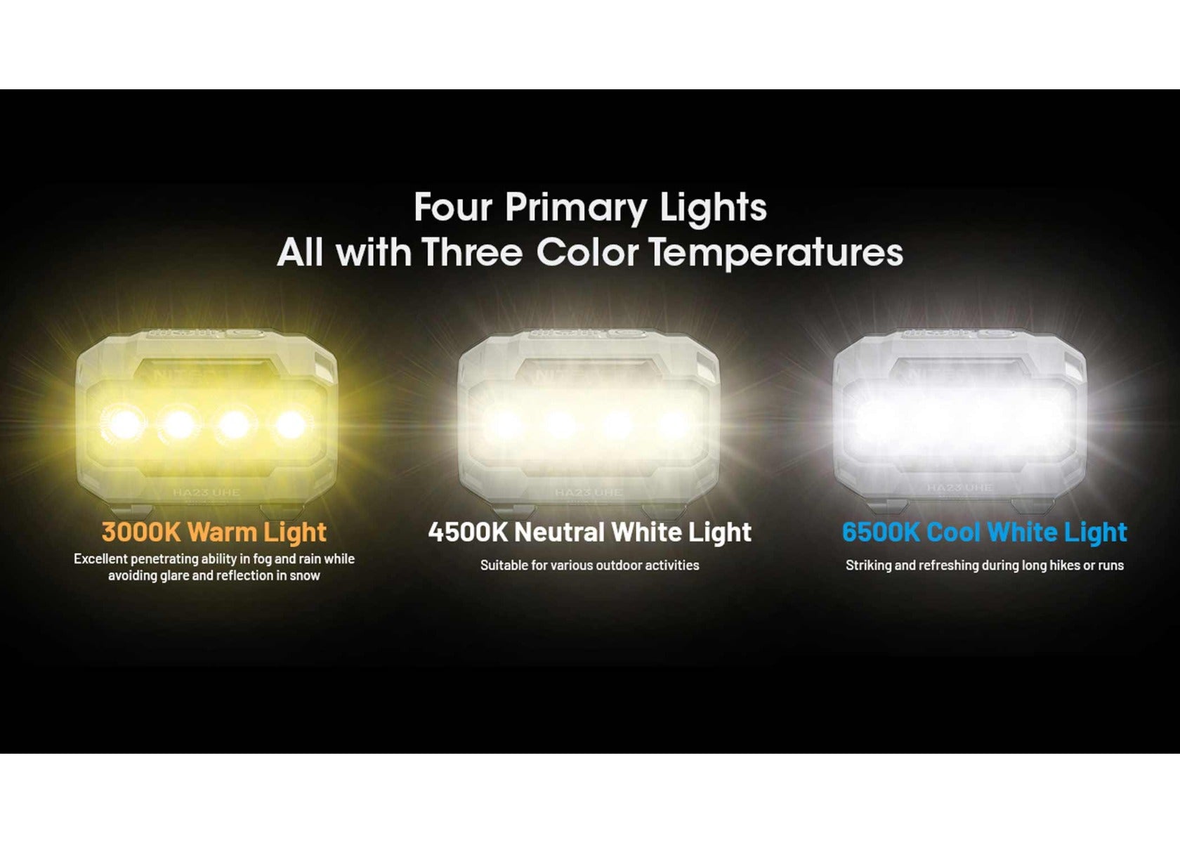 This light features multiple different modes including four brightness levels, three special modes, and two red brightness options. A primary light with different color temperatures like 3000K warm, 4500K neutral, and 6500K cool white outputs provide users with different options to suit your needs from when you need a trekking light or if you just need something simple. Warm light can be used for reading, while neutral and cool white can be used to serve any outdoor purpose. Need better nighttime vision? The HU23 UHE has an auxiliary red light mode with high, low, and flashing options to reduce eye strain and help signal to others right away.