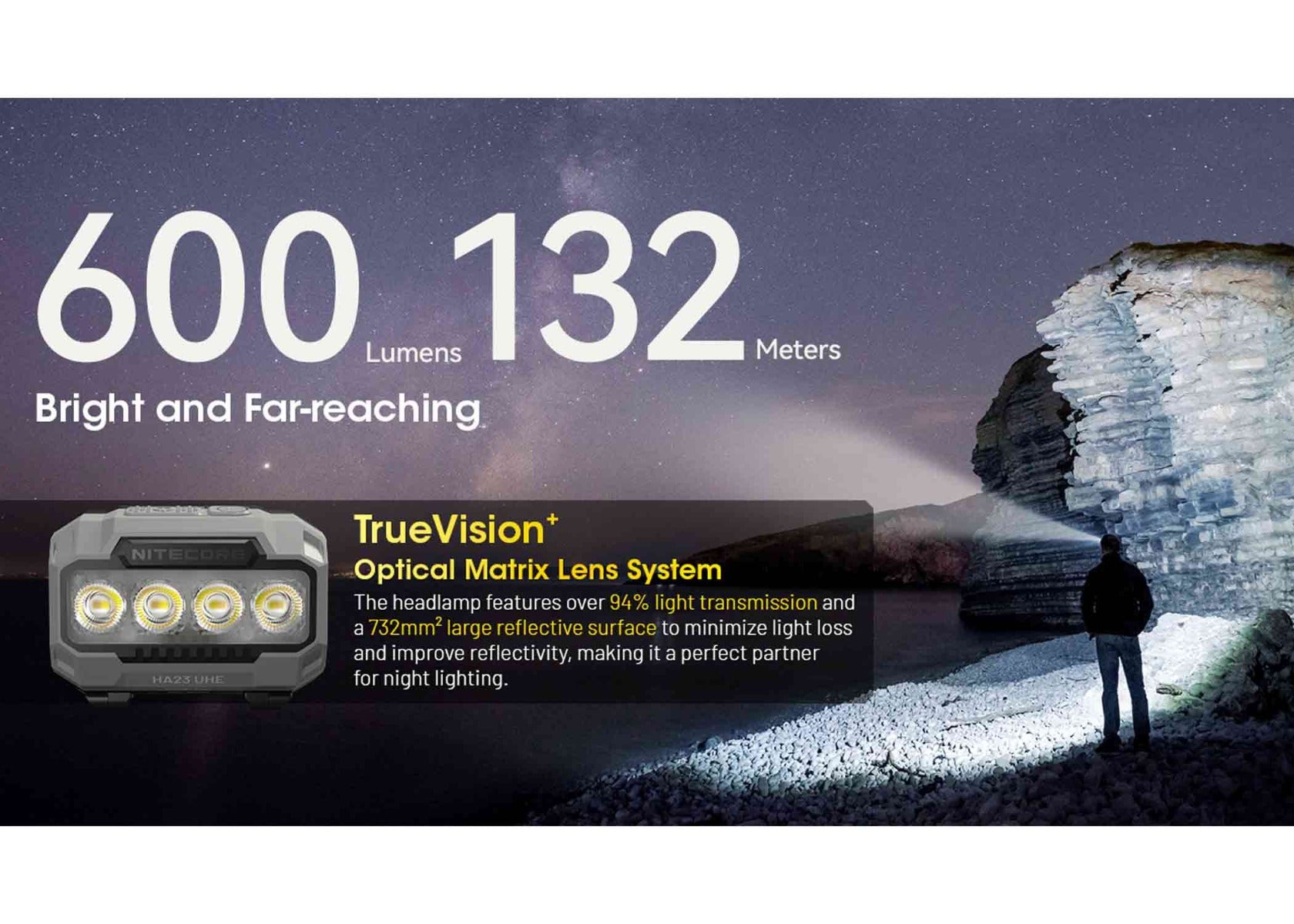 Whether you're on a run, camping, or exploring the outdoors, the Nitecore HA23 UHE has you covered. This headlamp is equipped with multiple color temperatures - warm, neutral, and cool white light for a number of uses ranging from piercing through fog and rain to lighting the path during your nighttime run. It has a variety of output modes to suit your needs with a max lumen output of 600 lumens down to an ultralow setting of 6 lumens. The headlamp has a throw from 45 ft up to 433 ft and over a 100° wide angle for ultimate close range and long-distance lighting to help illuminate your surroundings. The headlamp features over 94% transmission on its lens to ensure your light is outputted effectively, giving you a reliable outdoor companion.