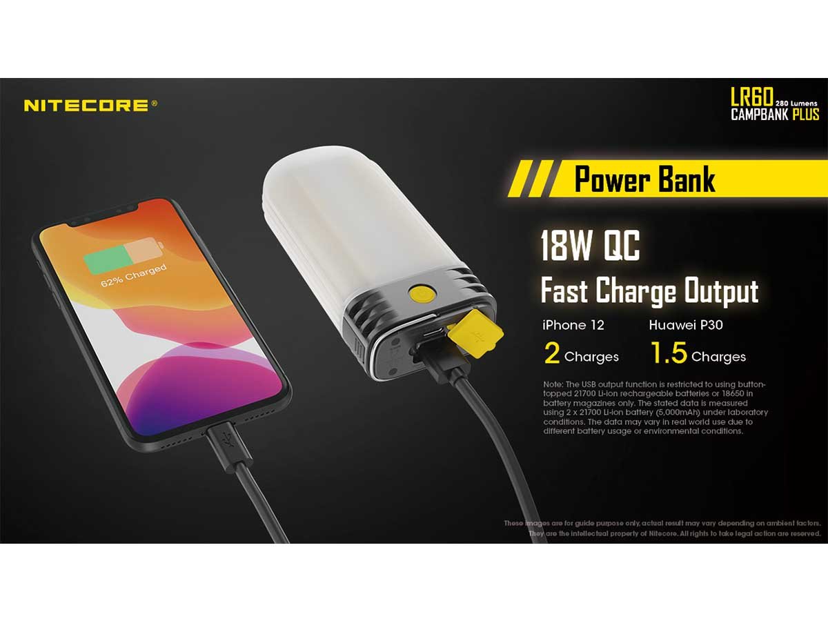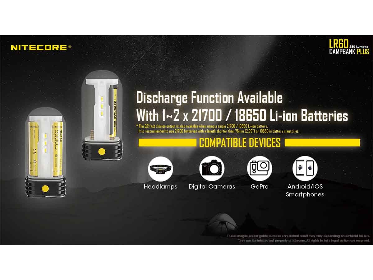 It's also possible to discharge power through the LR60 and turn it into a powerbank. Recharge headlamps, digital cameras, and smartphones with ease and have backup power while out in the wilderness.