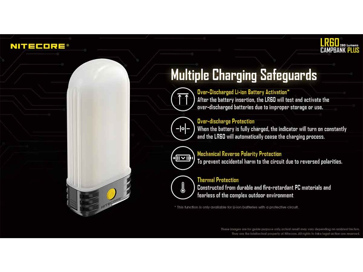 The Nitecore LR60 has mulitple charging safeguards in place ensuring that your batteries recieve the best care.Over-Discharged Li-ion Battery Activation