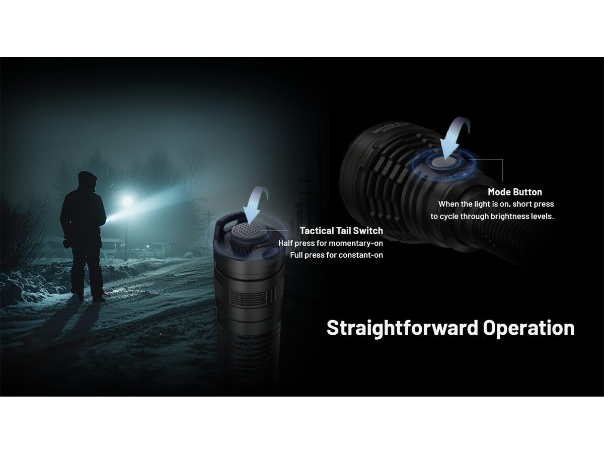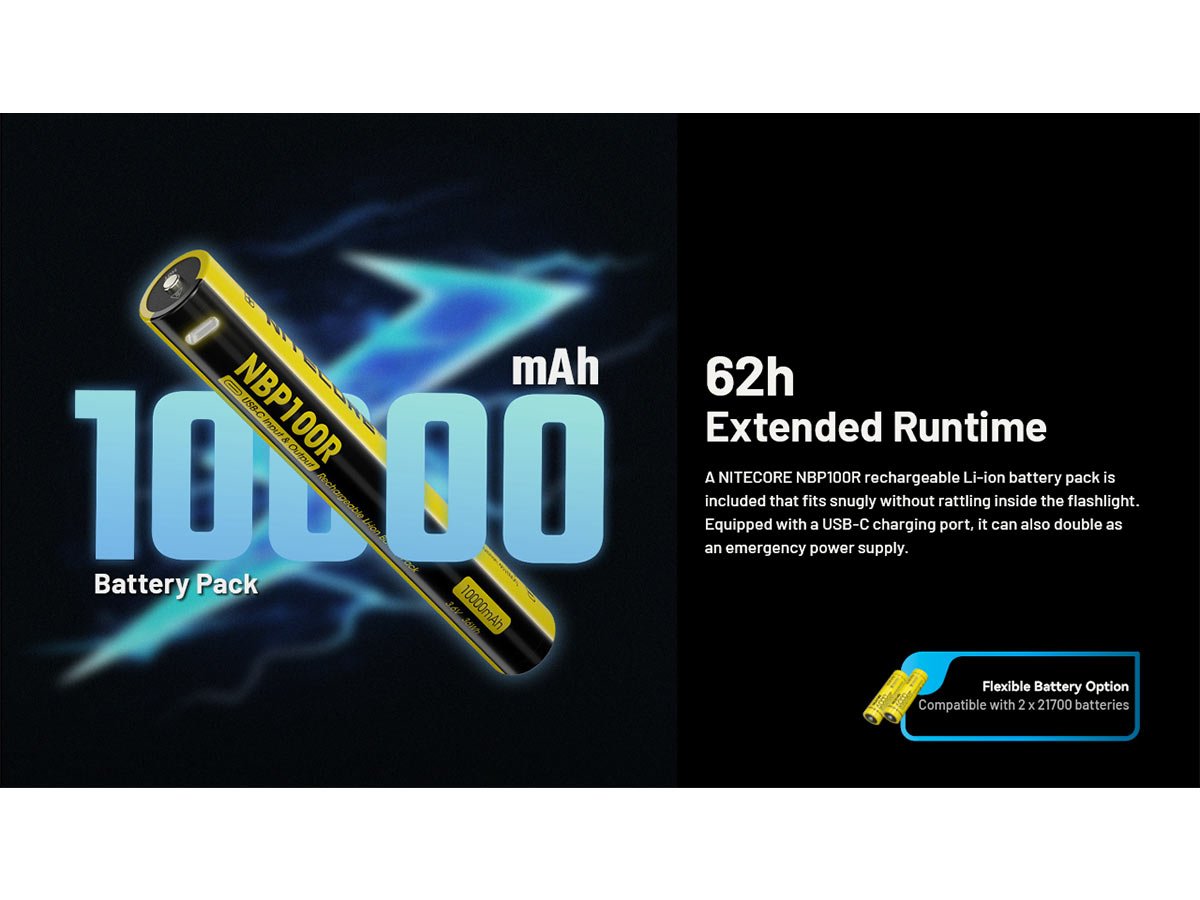 The MH40 Pro includes a rechargeable battery pack with a powerful 10,000mAh capacity that supports runtimes of up to 62 hours, or a little more than 2.5 days. Worry not about how long you spend outdoors, the MH40 Pro has your back! Alternatively, the flashlight also runs on 2 x 21700 batteries, for the freedom to use a power source most accessible to you. The included battery pack has a USB-C port for recharging quickly and easily. Charge from your laptop, power bank, and more for quick-access power.