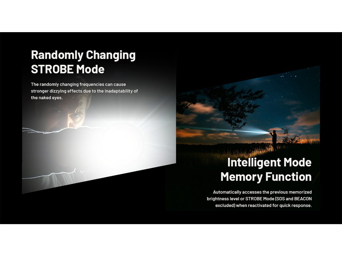 - » Strobe mode has random frequencies which aid further in self-defense