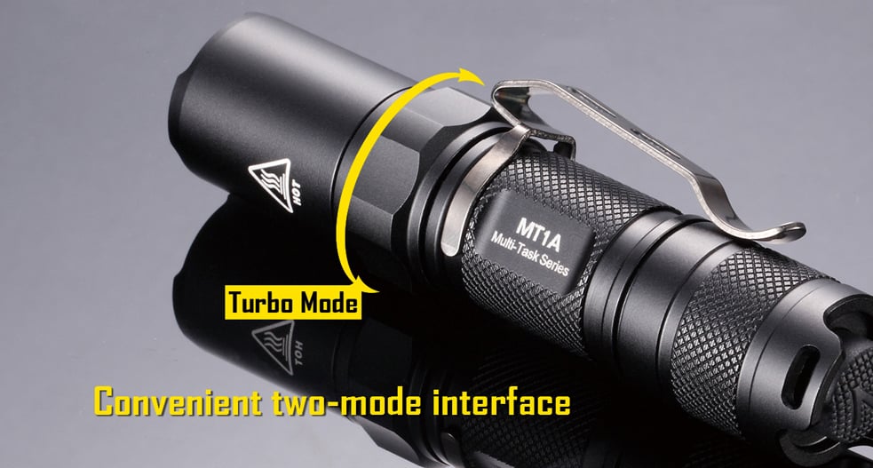 The Multi-Task Series' unique interface allows for instant access to exactly the mode you need. The head of the light can be twisted to two positions. When twisted to the left, the MT1A is in its user-defined mode, allowing you to cycle through four output modes, as well as a blinding strobe by rapidly depressing the tail-switch. The light will turn on its most recent mode. With the bezel twisted all the way to the right, the light is in its turbo mode. Depressing the tail-switch when in turbo mode will automatically engage the light's brightest setting. Turbo mode is perfect when you know you'll need instant access to the light's full power - when you're searching through a field, or looking down a trail. The user-defined mode is more useful in close quarter situations, when you may want to adjust your brightness repeatedly as you look through a tent or hallway.