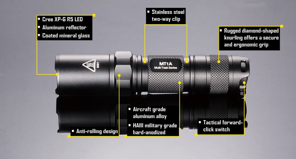 The single AA configuration is not only practical, but portable. The MT1A's body is only about four inches long, making it small enough to fit in any pocket or handbag. Despite its small size, this light produces 180 lumens in high mode using a XP-G2 R5 LED. The MT1A is built from hard anodized aluminum that's resistant to impacts, scratches, and corrosion. Precision machinery and O-ring seals allow an IPX-8 water resistance rating for total submersion in up to two meters of water.