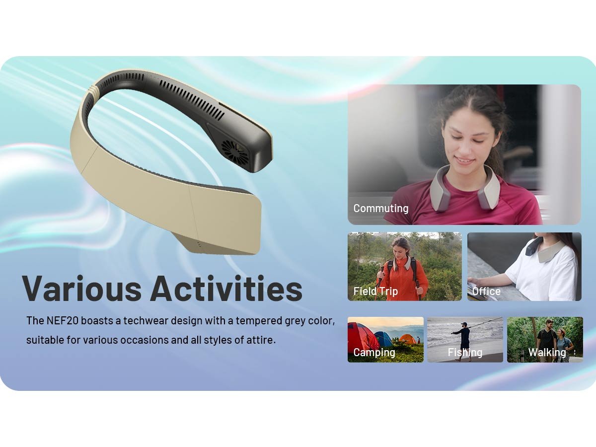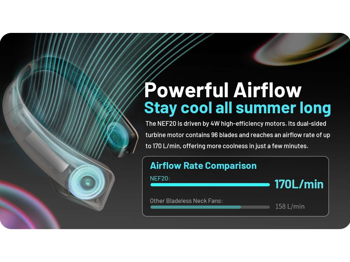 The NEF20 is outfitted with 3 air speeds, channeling as much as 170 L/min of air directly onto the neck. This airflow rate provides cooling in just a few minutes from activation, giving you a solution for hot summer days indoors or out.