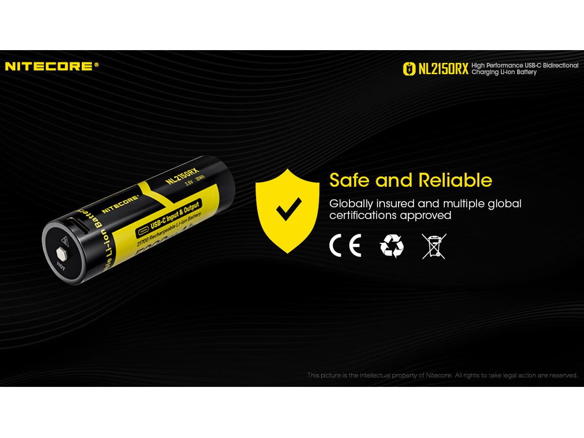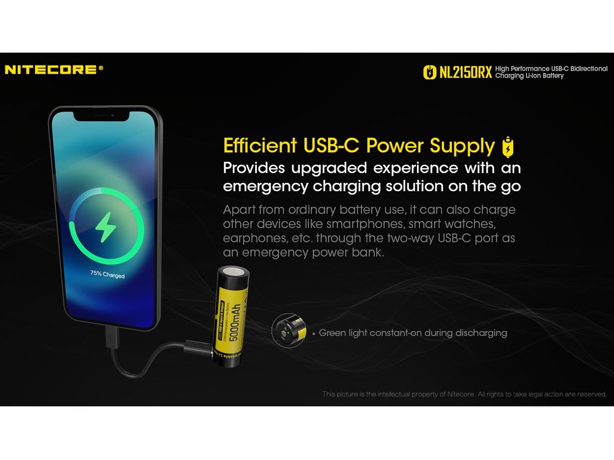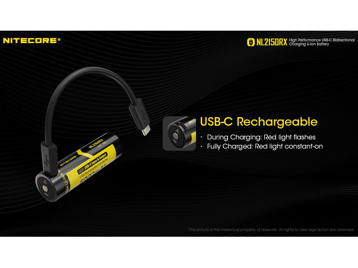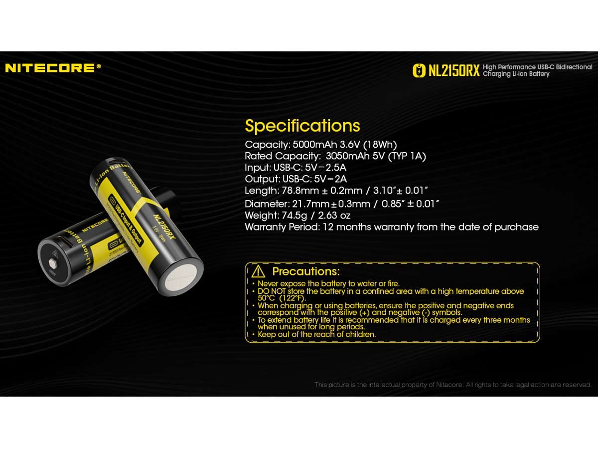 The Nitecore NL2150RX is an advanced battery capable of charging or discharging in the standard fashion or via its on-body USB-C port. This enables the NL2150RX to be used as an emergency power bank to charge your phone or other devices. This is also an excellent choice for a power source for high-powered flashlights compatible with a 21700 battery, providing a high capacity for lengthy runtimes.