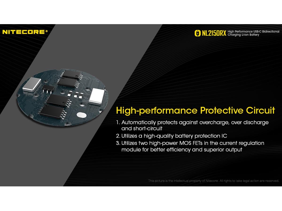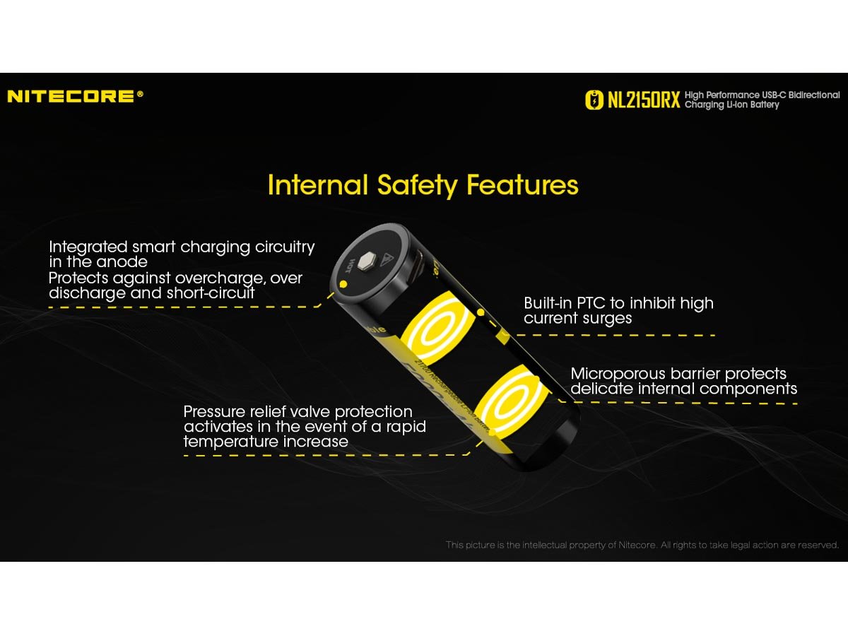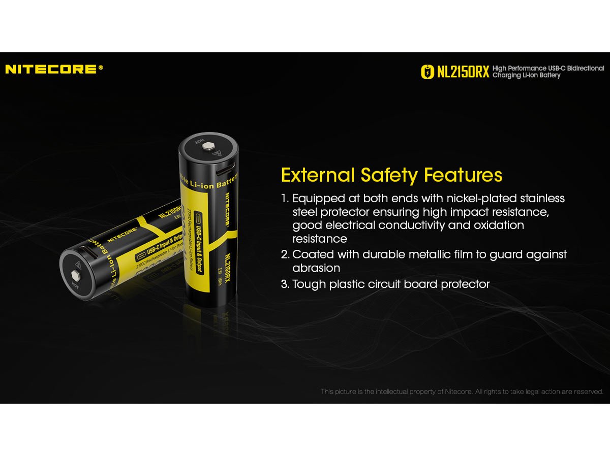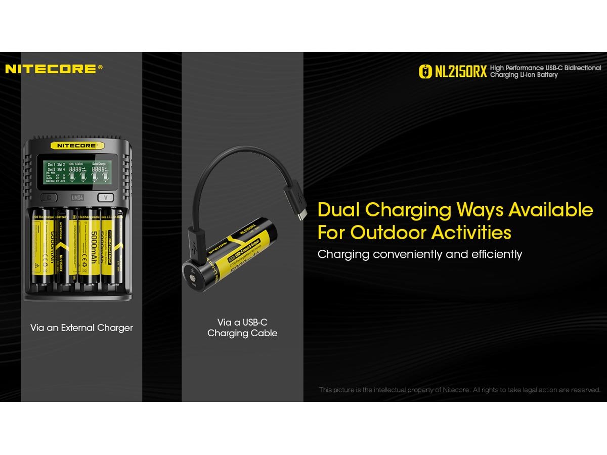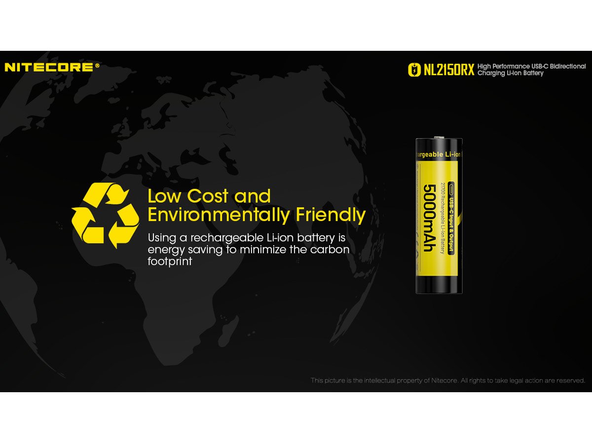 The Nitecore NL2150RX is an advanced battery capable of charging or discharging in the standard fashion or via its on-body USB-C port. This enables the NL2150RX to be used as an emergency power bank to charge your phone or other devices. This is also an excellent choice for a power source for high-powered flashlights compatible with a 21700 battery, providing a high capacity for lengthy runtimes.