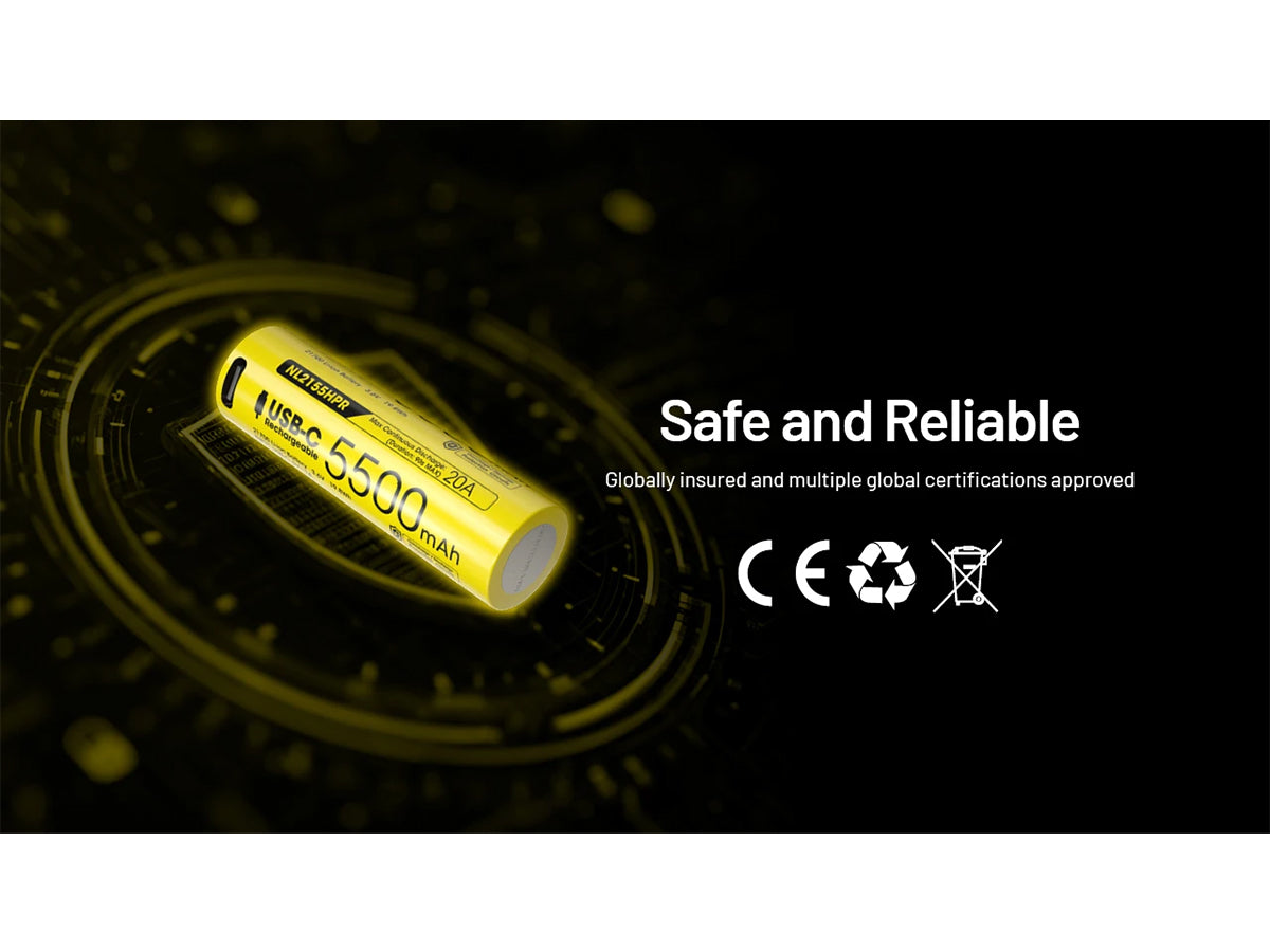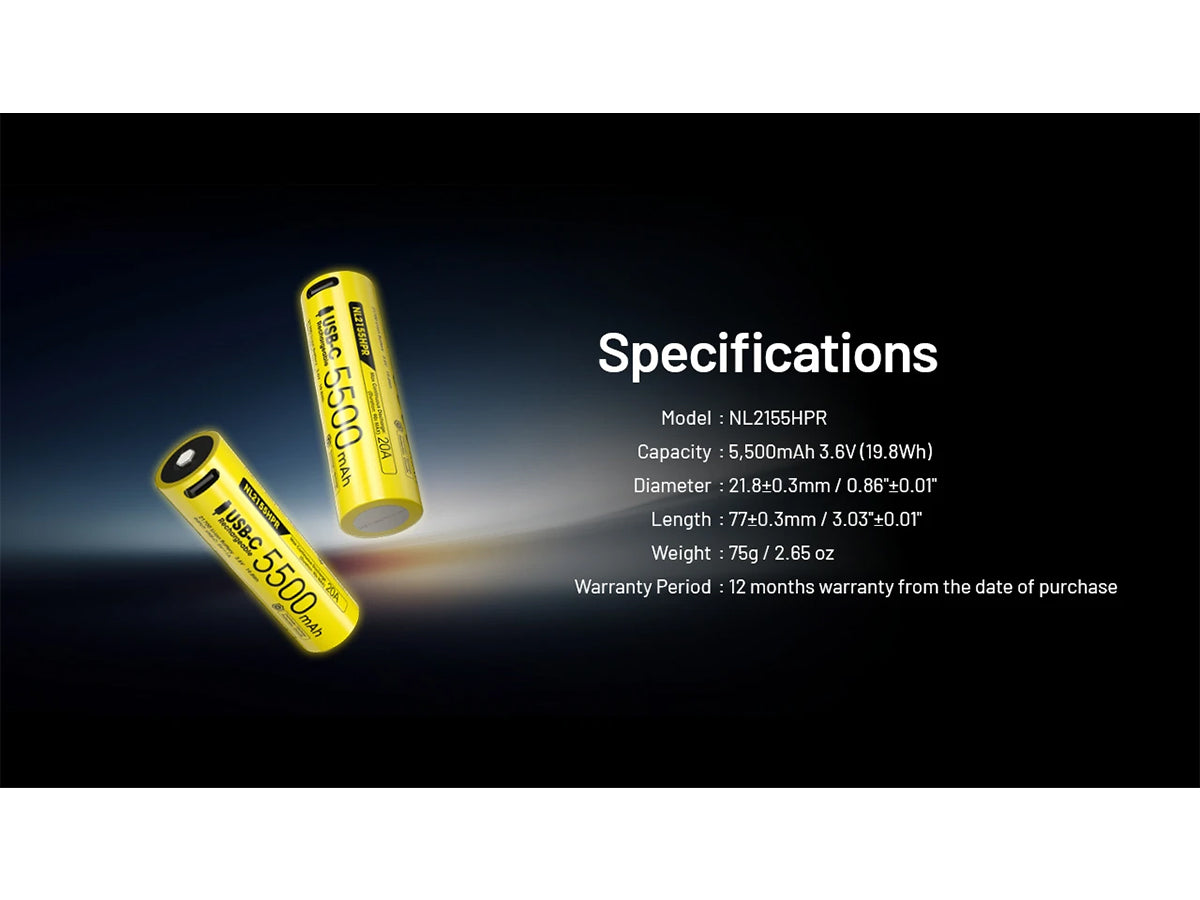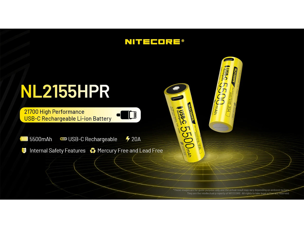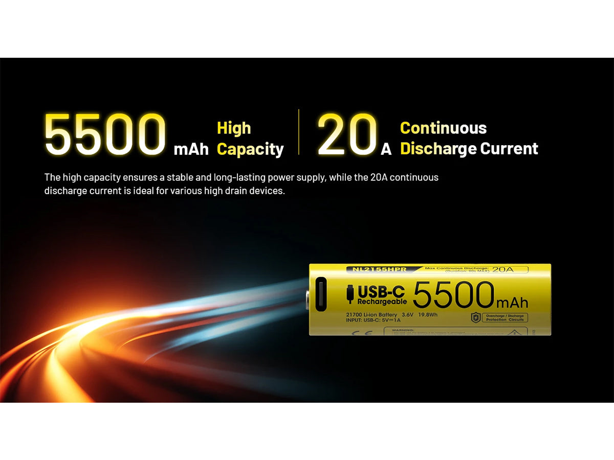 Power your high-performance gear with the Nitecore NL2155HPR, a 21700 rechargeable battery built for reliability and convenience. With a massive 5,500mAh capacity, it delivers extended runtimes so you can stay focused on tasks instead of your charge level, while the 20A continuous discharge ensures consistent, dependable output for high drain devices. Recharge it your way with the built-in USB-C port for quick, cable-based charging or use a compatible external charger for added flexibility. Designed with multiple internal safety protections, including safeguards against overcharging, over-discharging, and short circuits, this battery provides peace of mind along with the power you need for everyday and high-demand use.