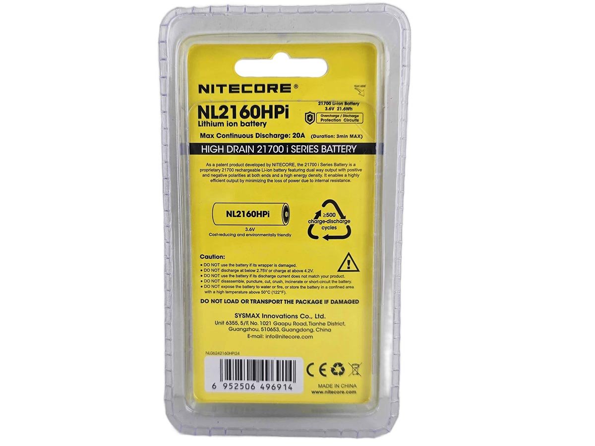 Nitecore NL2160HPi 21700 6000mAh 3.6V Protected Lithium Ion (Li-ion) Button Top Battery for the iSeries Flashlights