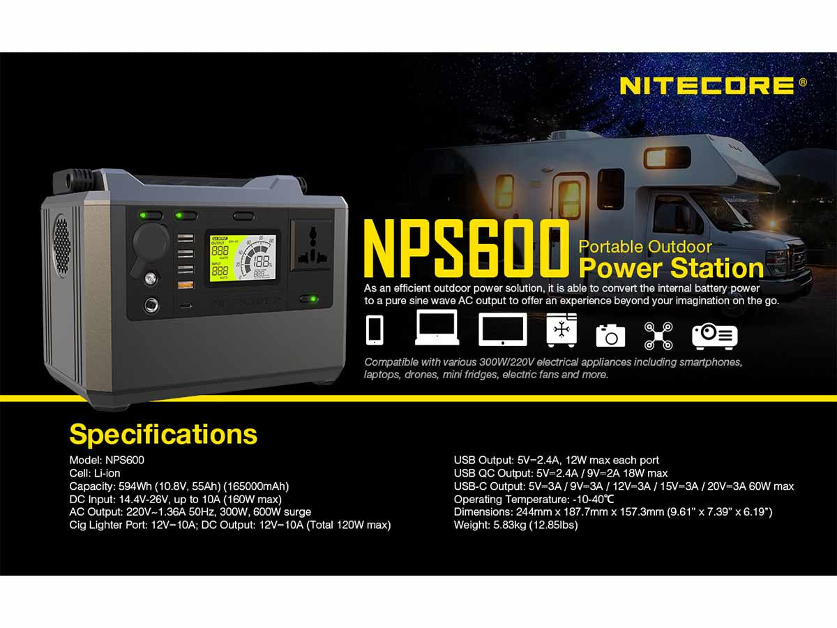 The Nitecore NPS600 is the ultimate portable power station that can help you recharge or power electronics on the go! The NPS600 converts internal battery power to Pure Sine Wave AC power. Pure Sine Wave power is often required in some appliances and devices due to its reliable outputs. Electronics you have powered by the NPS600 are sure to perform to their full specifications. The internal li-ion battery has a high 165000mAh capacity for superior power distribution and energy storage. This station comes equipped with an AC power socket, four USB ports (that can be used simultaneously), a DC and cigarette lighter port for any and all charging needs. This model can provide power for bigger appliances, and you can even keep your mini-van or motor home's battery maintained with it.