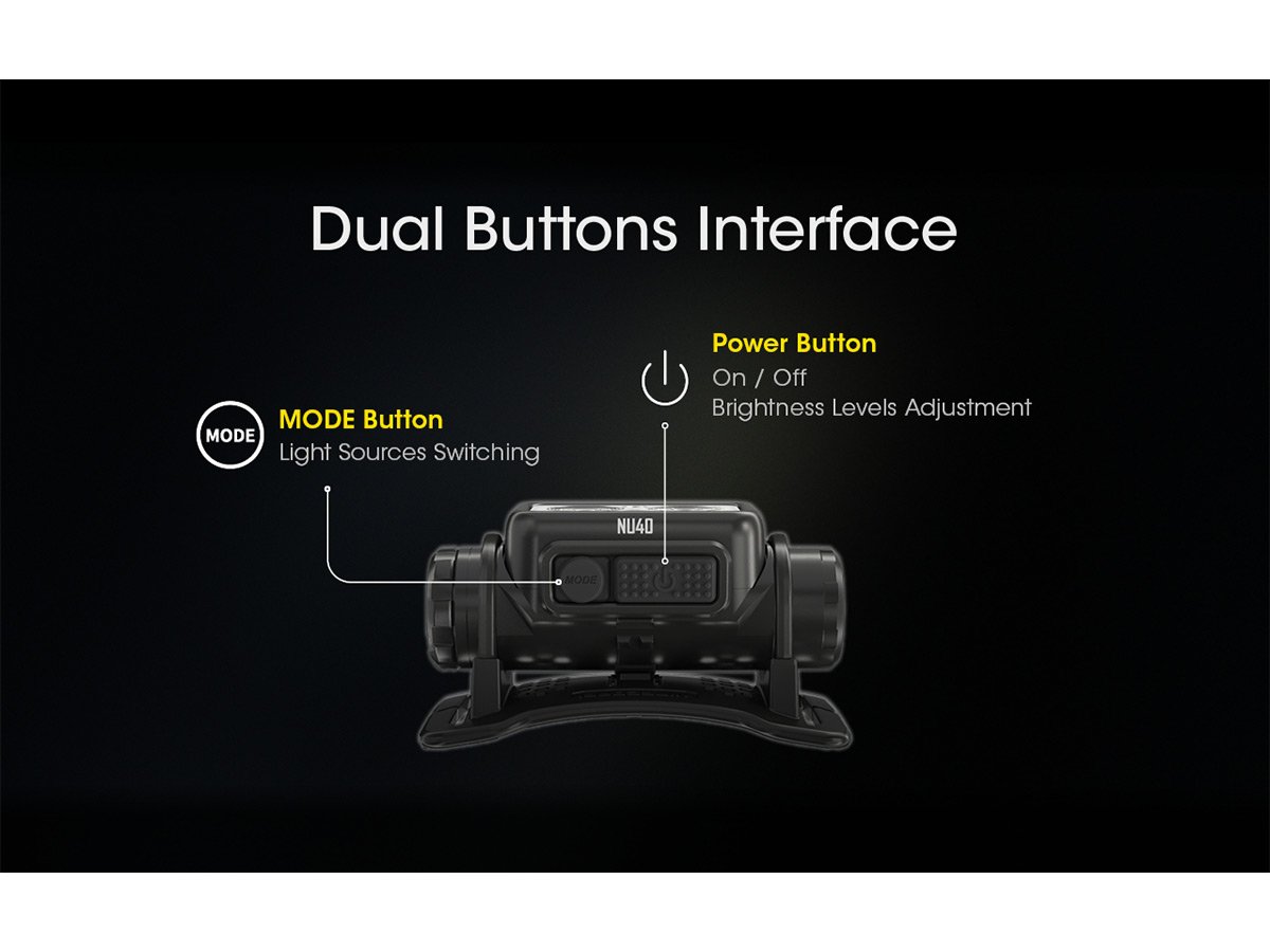 Dual buttons and a rotating base give you precision control of your lighting. The Power button allows you to toggle through high, medium and low levels, while short pressing the Mode button switches light sources between white and red LEDs. SOS is always accessible by double pressing the Mode button. Turbo mode is instantly accessible by double pressing the Power button while the light is activated, while ultra-low is accessible by double pressing the Power button when the light is deactivated. Built with an Optical Sensor to keep you safe, your NU40 can sense when objects are close and will automatically drop down in brightness to protect the battery from overheating and your eyes from potential damage. The rotating base allows you to easily command the direction of your beam, giving you the power to cover more area or avoid shining light into the eyes of others. Thanks to its simple operation, the NU40 is a great light to keep on hand for a wide range of projects or excursions.