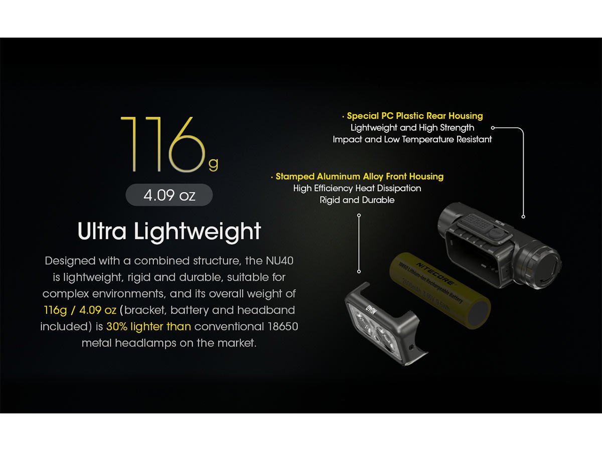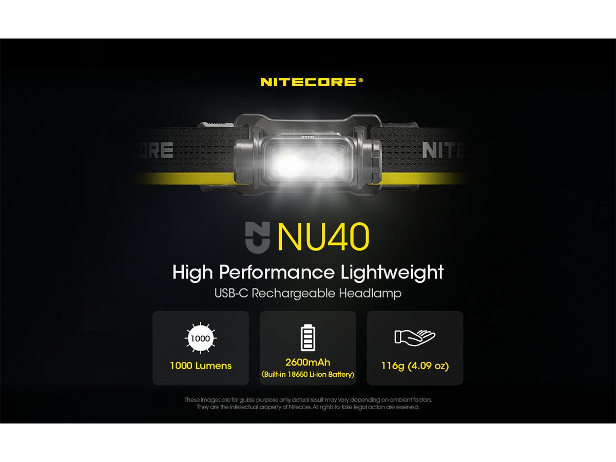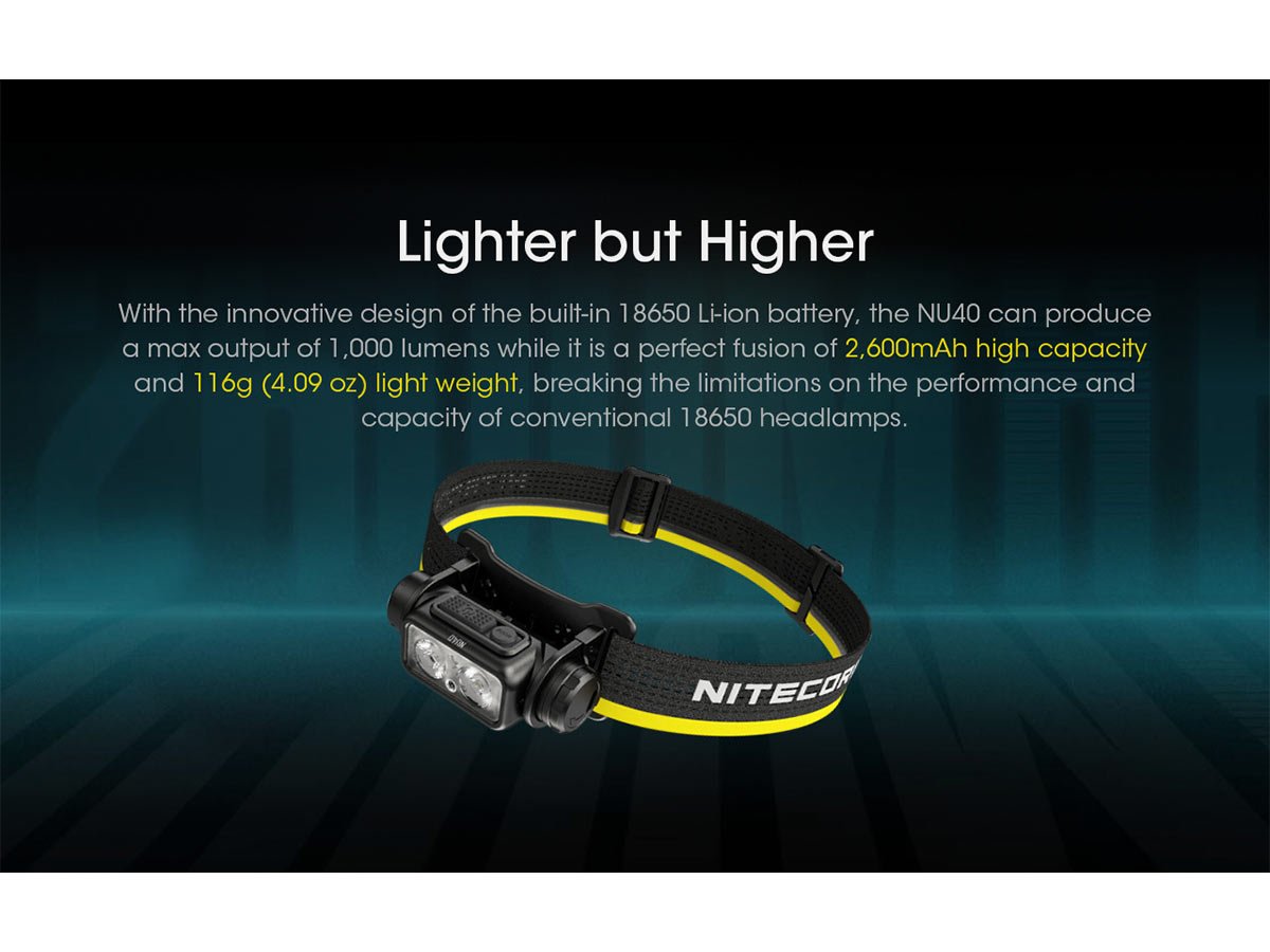Nitecore NU40 USB-C Rechargeable LED Headlamp - 1000 Lumens - Uses Built-in 2600mAh Li-ion Battery Pack
