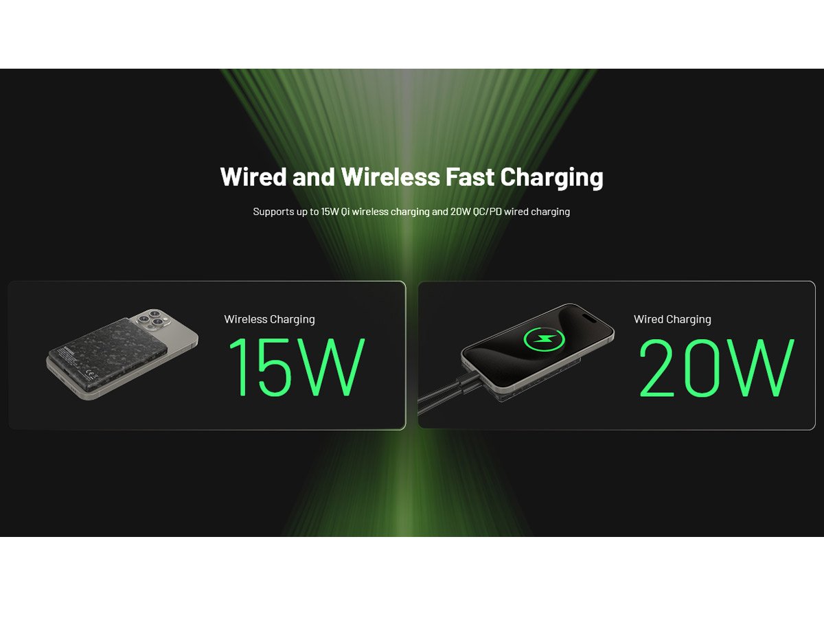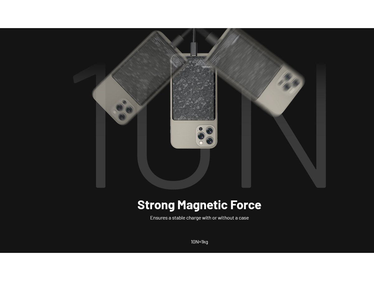This power bank offers you 15W, fully wireless charging through its magnetic base so that you can always recharge your phone, even if you forgot its power cord at home. Don't worry if you use a case though, the magnetic force is strong enough to still charge your phone directly through it! If your case is too bulky or your phone doesn't support wireless charging, you can also recharge from the NW5000's output port with 20W power delivery. Its power level display indicates its own charge level and when it's recharging wirelessly so that you always know when this power bank is ready for use and that it's performing properly.