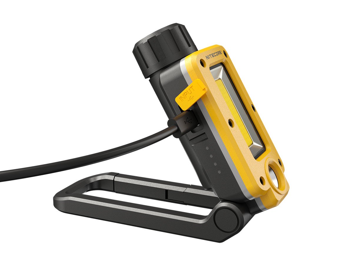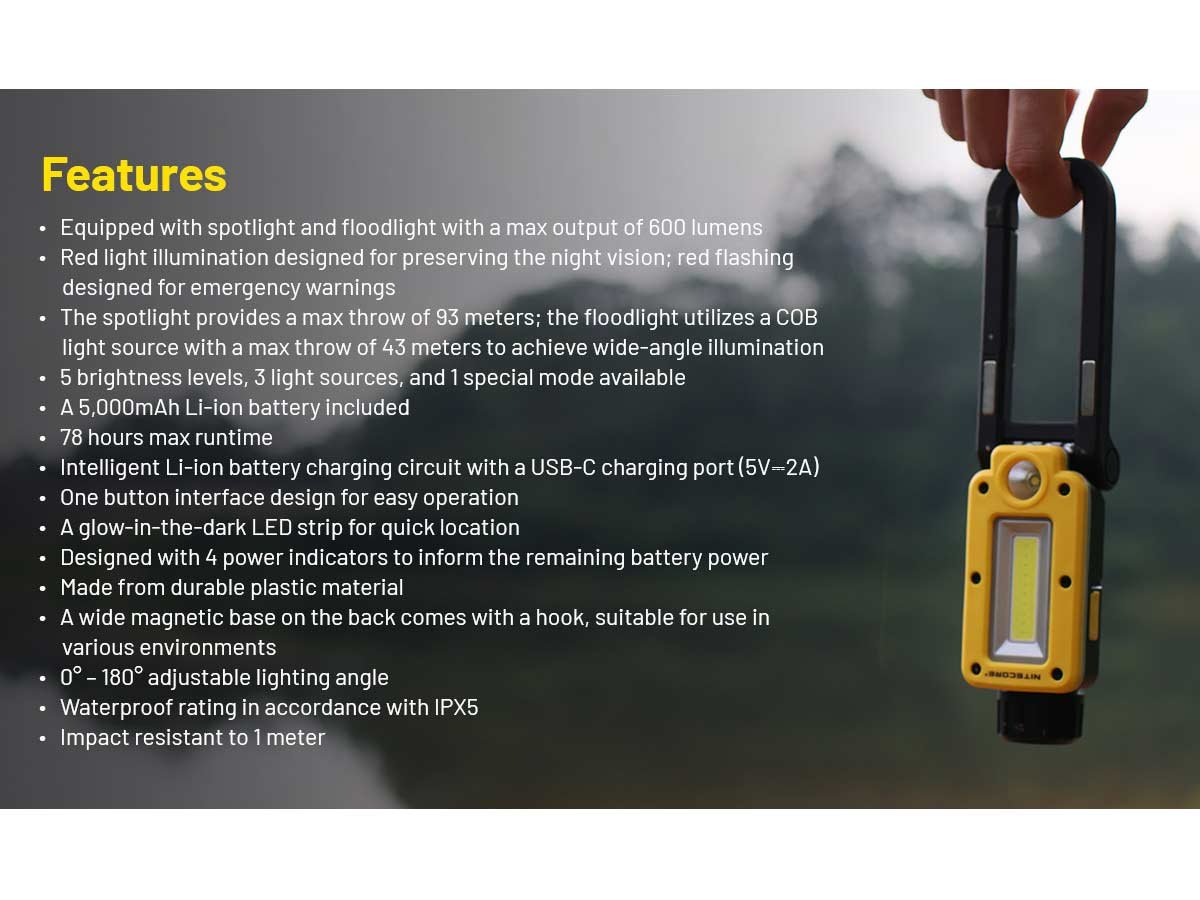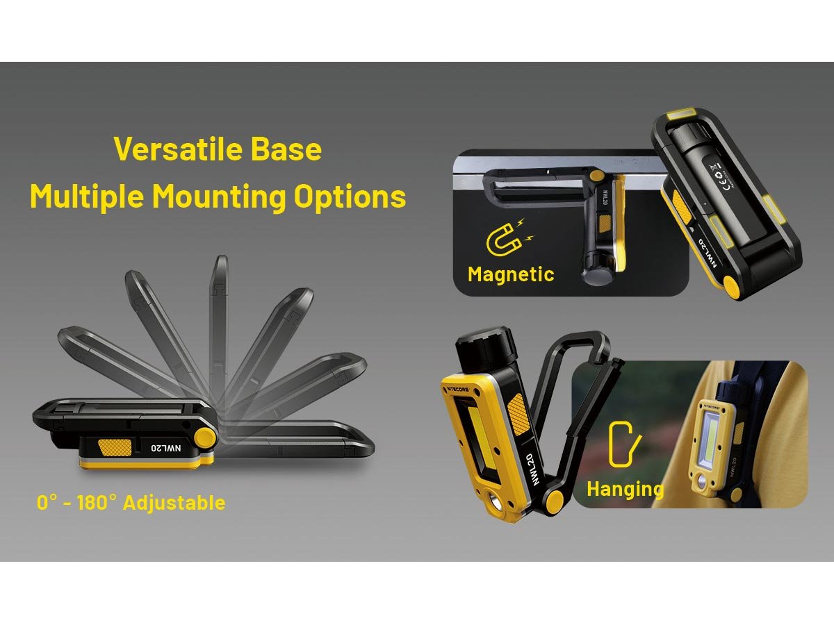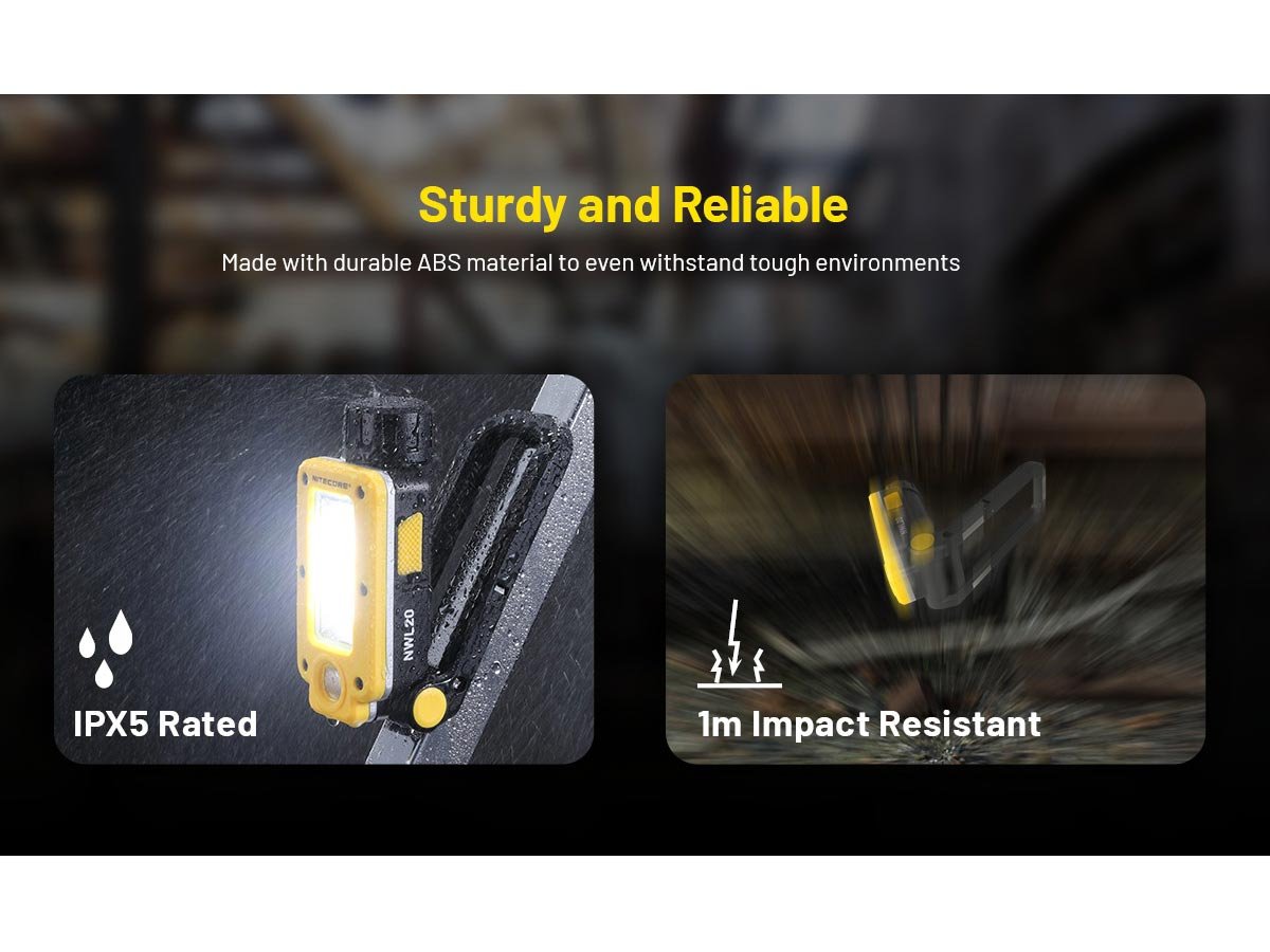The Nitecore NWL20 is a 600-lumen worklight complete with spot and flood LEDs as well as red light capability. The light has a magnetic base and 180 degrees of adjustability, providing extensive lighting options. In addition, the back panel opens for use as a hook to offer even more illumination solutions. These options make the NWL20 excellent for use under the car hood, at a worksite, or out camping!