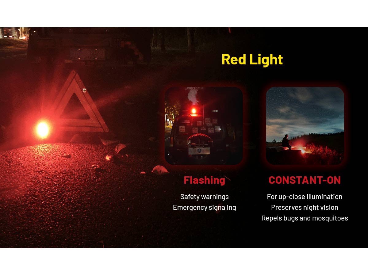 - » 2 red light outputs for emergency signaling, preserving night vision, and repelling bugs